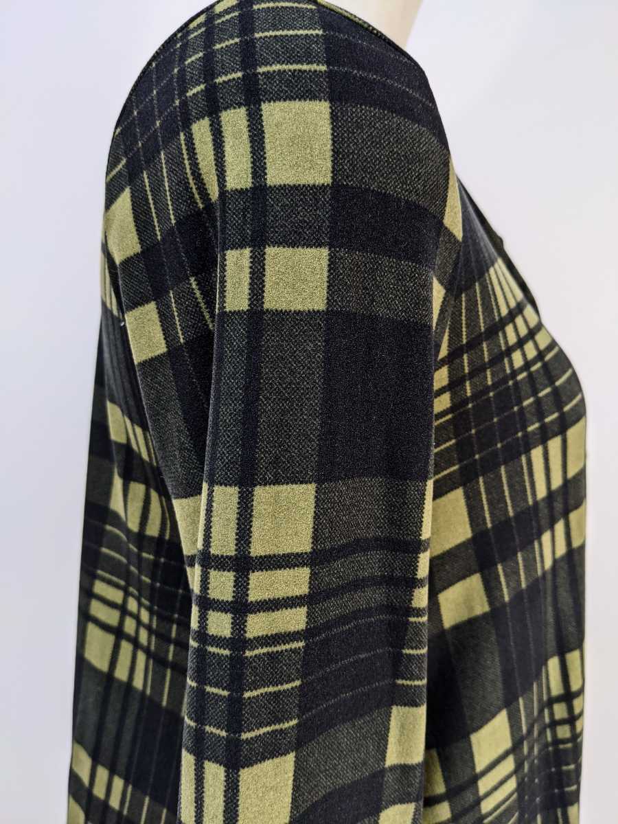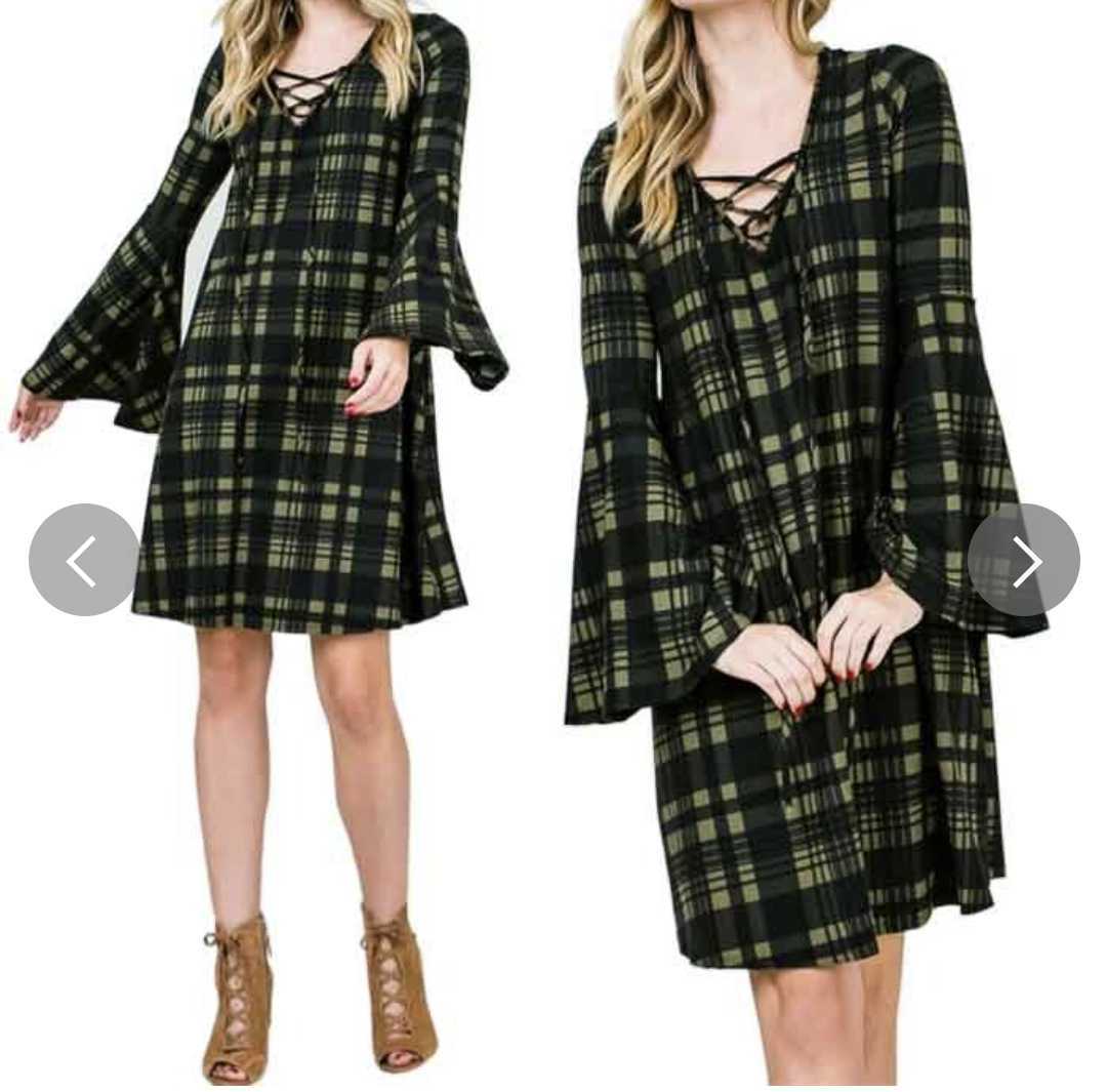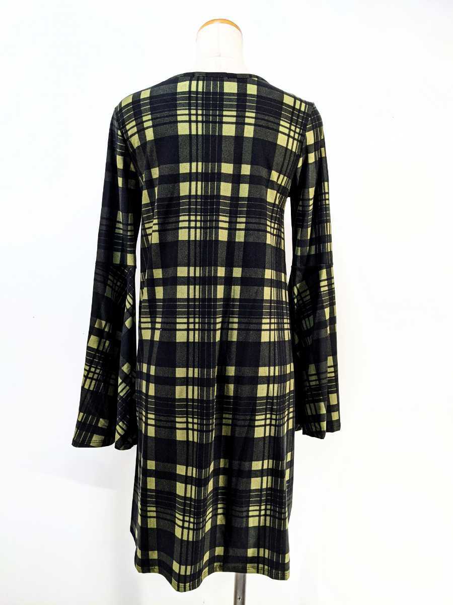 胸元の編み上げデザインとたっぷりのベル袖、ゆるめのフレアーが効いたスカートの美しさと、あまり出回らないオリーブグリーン色のチェック柄が個性を発揮しています!