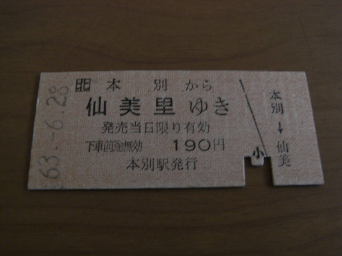 池北線 本別から仙美里ゆき 190円 昭和63年6月28日 本別駅発行