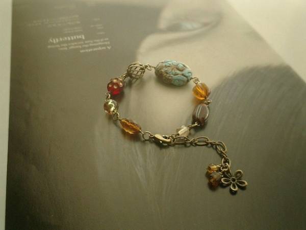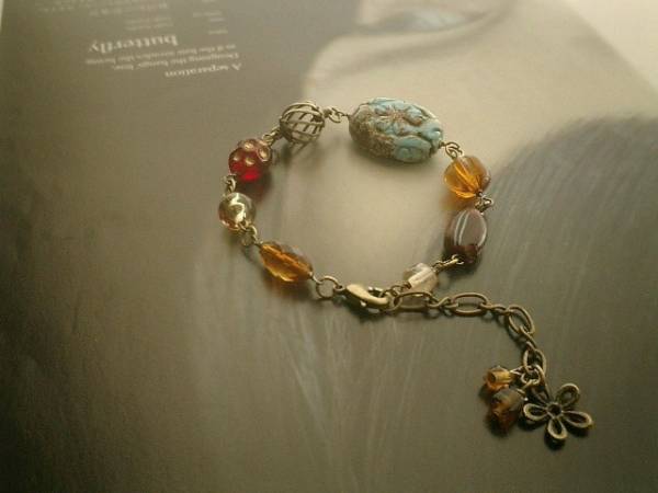 自分探しの旅・・シリーズです♪オリエンタルロマンに染まって・・チャイナ仕様の石を集めてシックなブレスレットです♪25×18ミリのオーバルのお花彫りのマグネサイトターコイズをメインに8ミリから15ミリ位までの大きさ違い、デザイン違いのとんぼ玉やチェコビーズやメタルチャームを合わせました♪シックな色合いでまとめて大人の表情です♪長さは全長23センチ位で調節自由です♪♪お揃いのネックレスやイヤリングも出品しています♪シンプルで飽きのこないいつまでも着けられるデザインを考えて作りました!ハンドメイドをご理解頂いてノークレーム、ノーリターンでお願いします