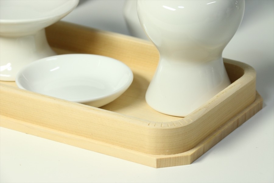| ・長折敷(木曽ひのき材) 1尺(高さ2.5 幅30.5 奥行10.5) ・高杯 2.5寸(高さ4 径8.5)×1 ・榊立 4寸(高さ12.3 幅6.5)×2 ・瓶子 3寸(高さ10 幅6.2)×2 ・水玉 2寸(高さ6.5 幅5.5)×1 ・皿 2.5寸(高さ1.8 幅7.9)×1 | |||