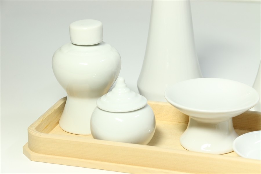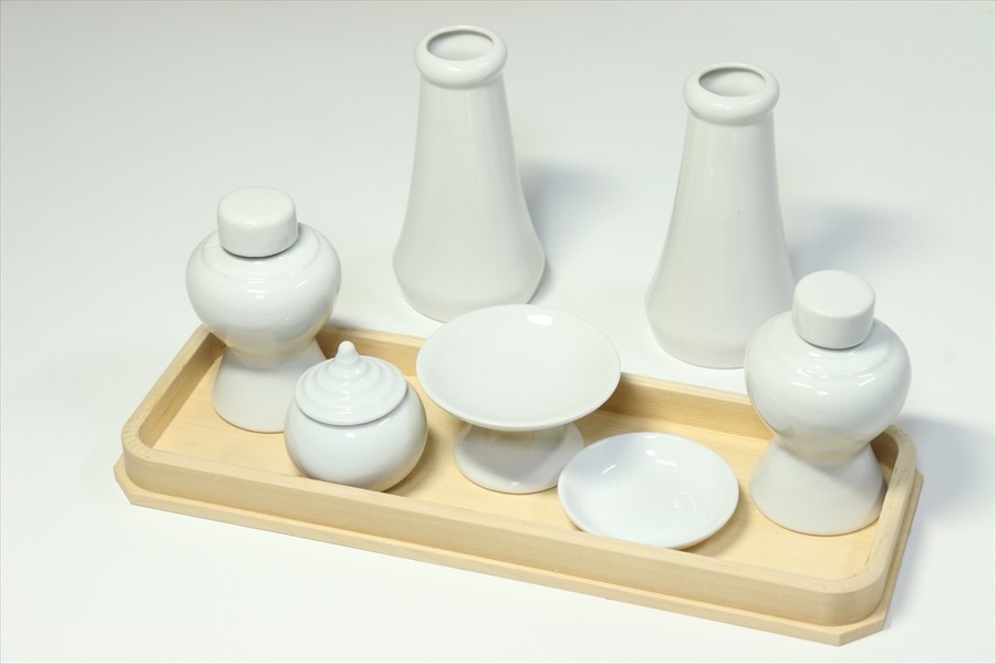 | 木曽ひのき製の長折敷になめらかな質感と光沢、国産「せともの」陶器製の白無地の神具セット。お祀りに必要な榊立、平次、水玉、そしてお米はお皿ではなく、ワンランク上の高杯にて神様にお供えしましょう。中・大型(横幅90cm程度まで)の神棚に最適なサイズとなっています。 | |||