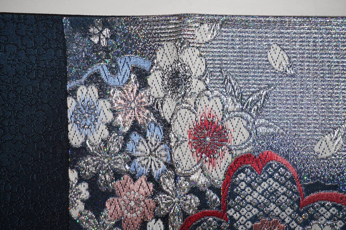 仕立てつき晴れ着用帯 西陣6通柄袋帯 絹80% その他20% 銀紺色(裏地は黒色)ピンクでハート 新品み仕立て品ですがこのお値段で仕立てつきで、納品です。なお、最終日まで待っていただかなくとも、入札した時点でオークションは終了し落札者となります。お値段的にもお安く設定いたしましたお買い得品です(西陣帯です)。もちろん綿芯込みの仕立て付きですが、仕立てなしの場合でも金額は変わりません。