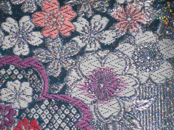 なお、帯柄左上に無地で出ているところは裏無地、たれ、中無地(手先と前太鼓のあいだの無地部分)、太鼓部、前腹部となります。六通柄です。金銀糸が多用されているためストロボの照りで、しろぽく写っている部分があります