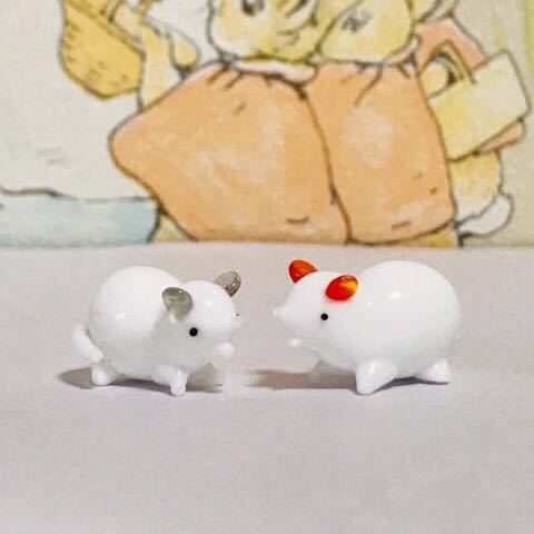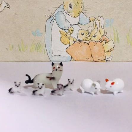 ・なんだか懐かしく、とても小さくて可愛い猫さんの親子とつがいのねずみさんのガラス細工になります。