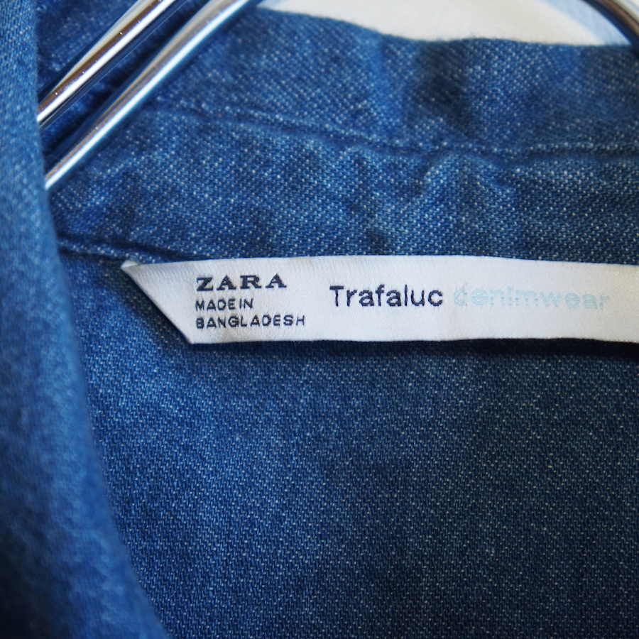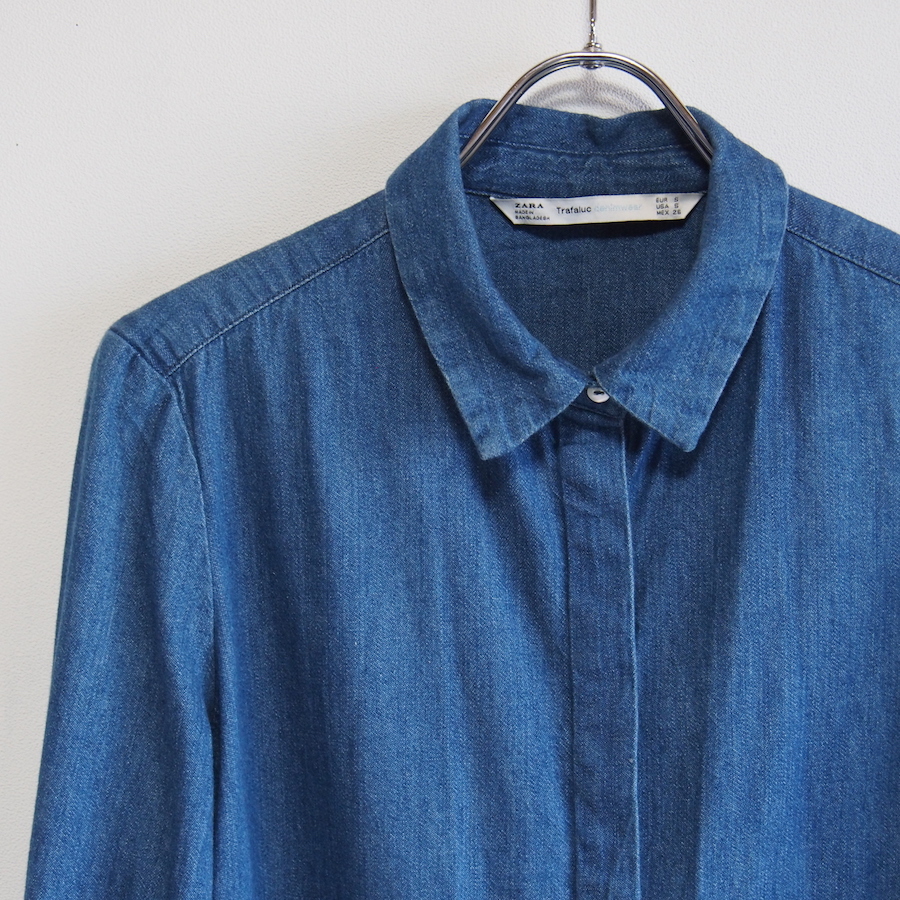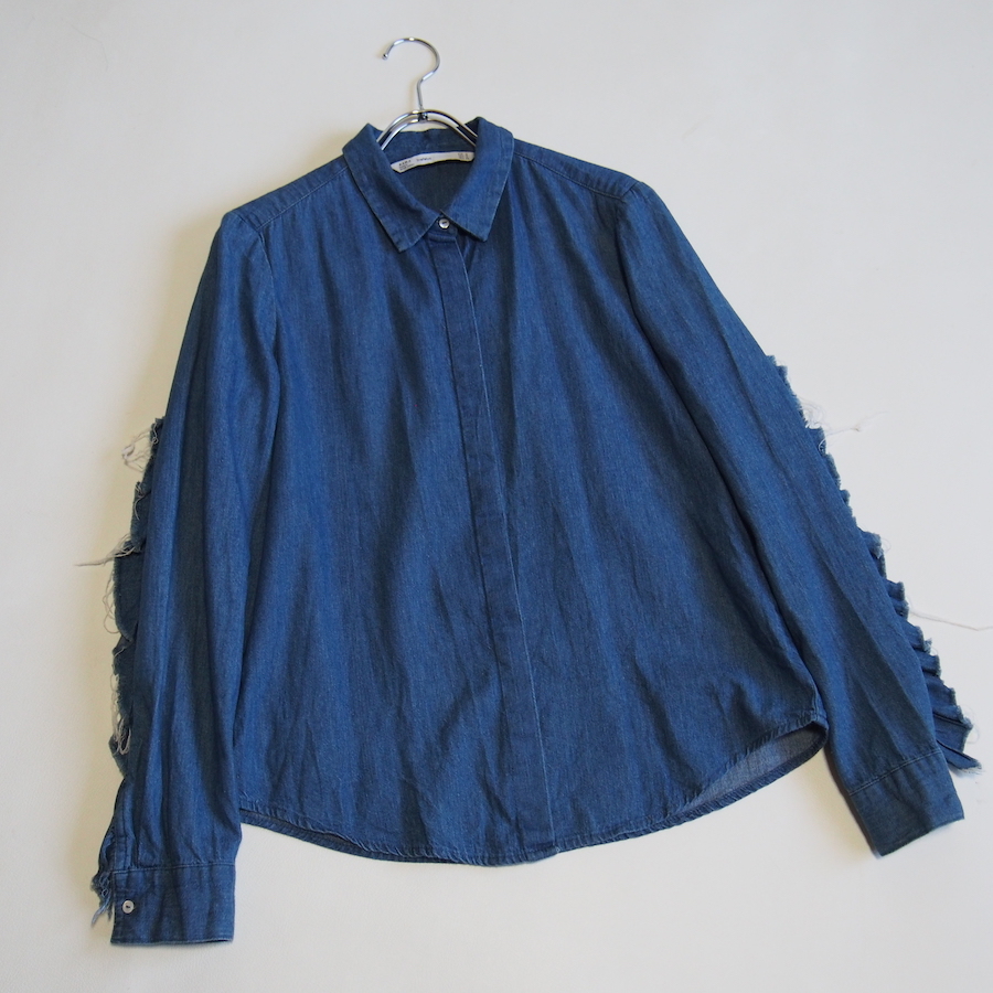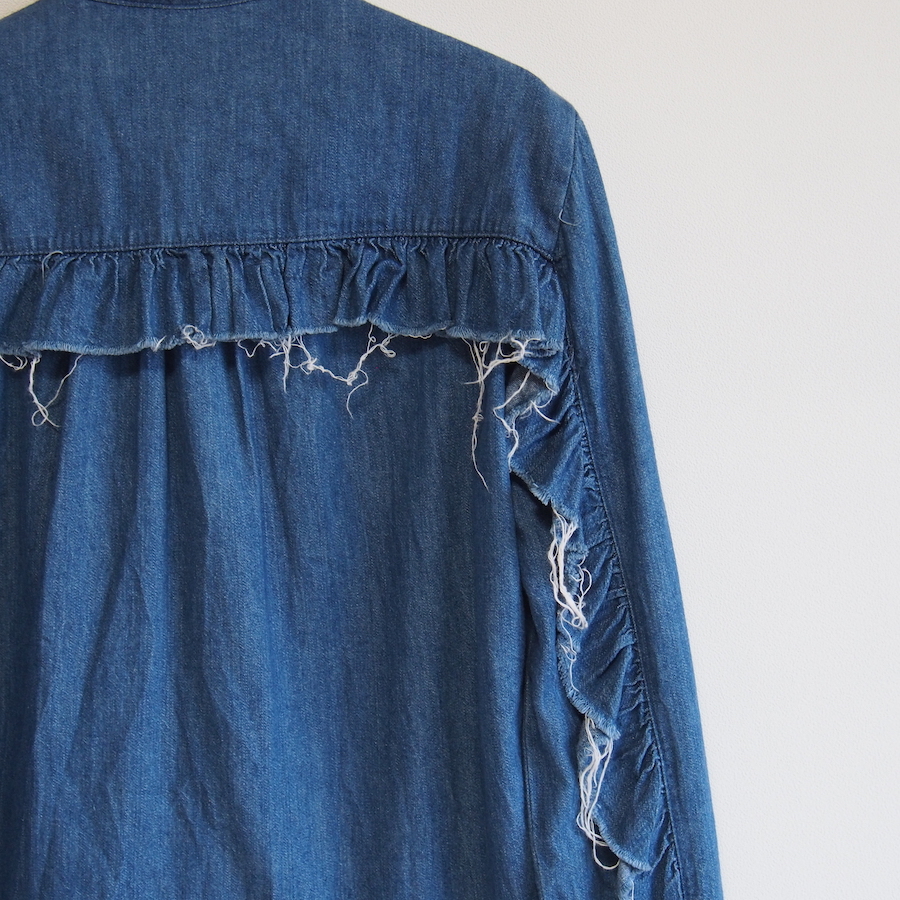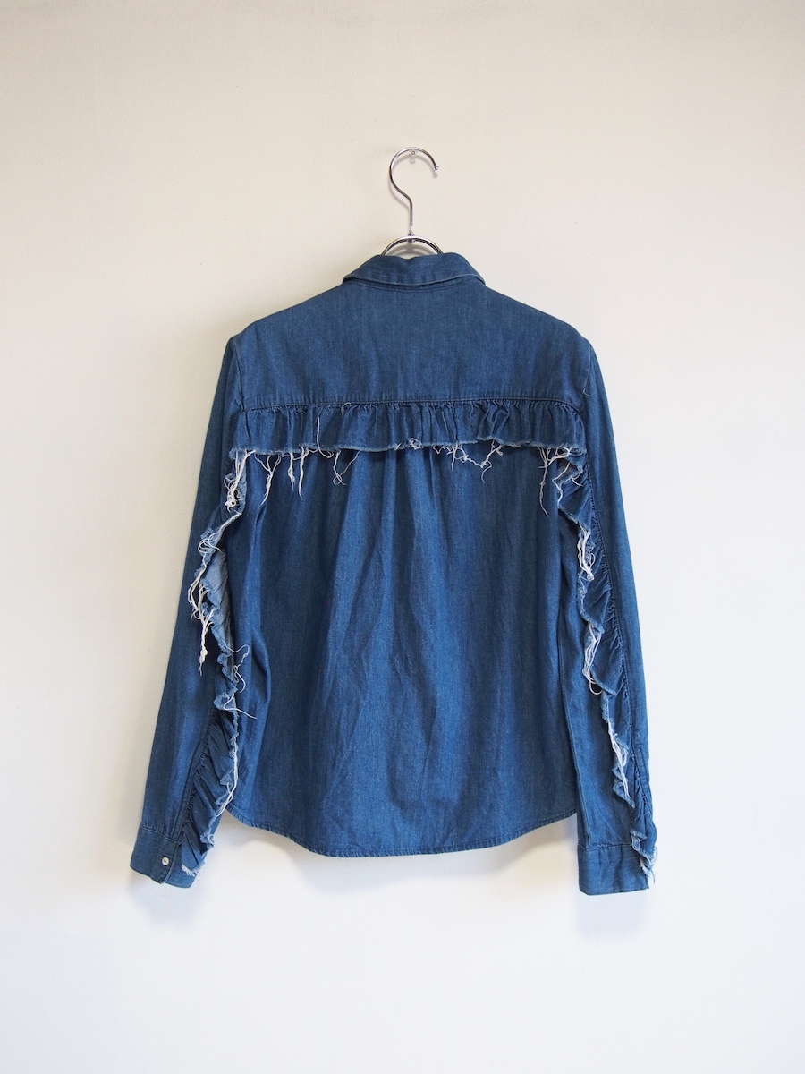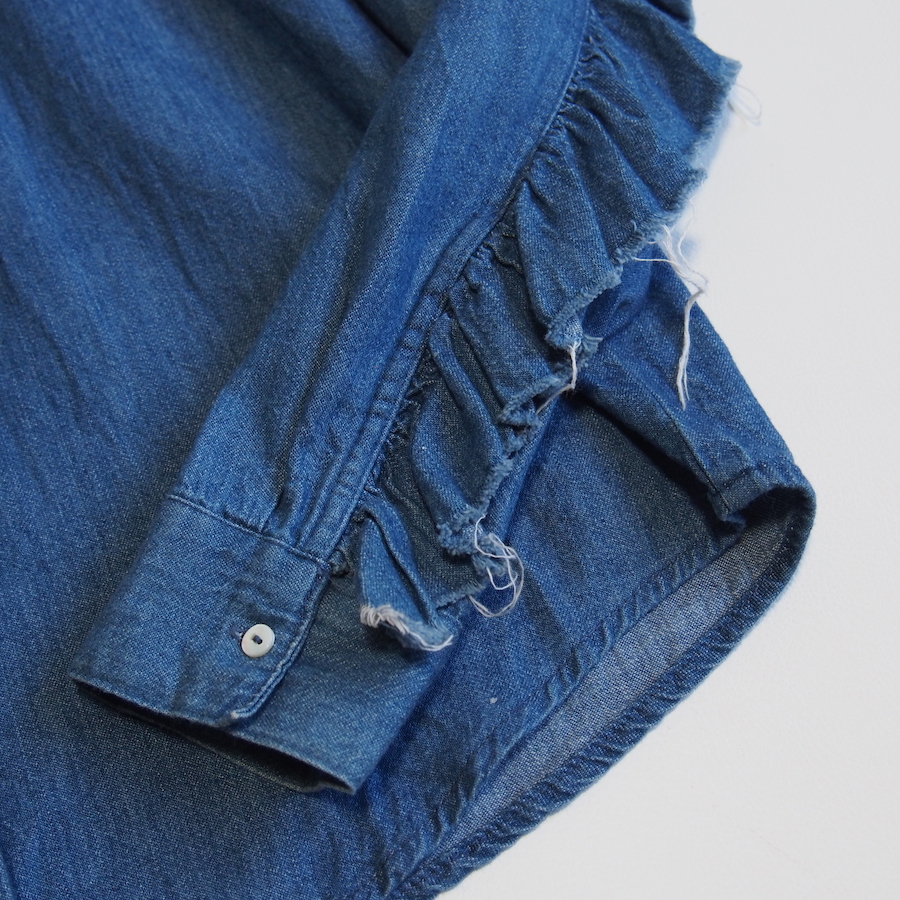 断ち切り処理されたフリルがバックから袖先まであしらわれたデニムシャツです。 その分、フロントは比翼仕立てですっきりとしたデザインです。
