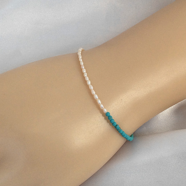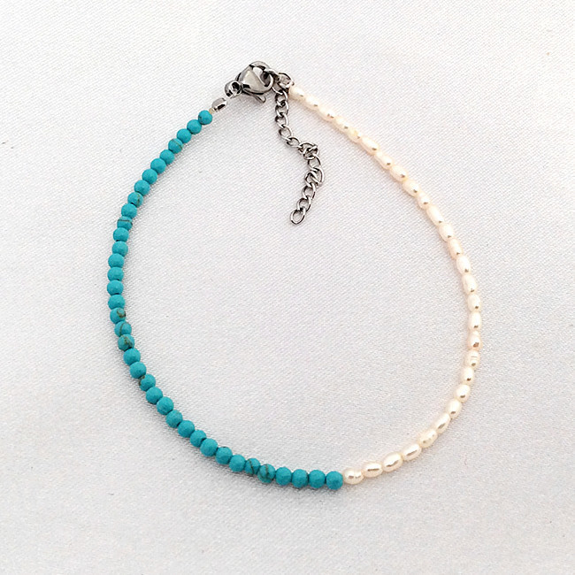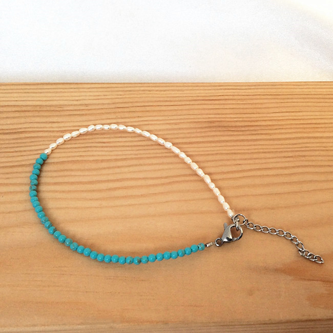 ●金属素材:ステンレス。●淡水真珠:粒約1.5X3mm、天然の真珠であるため。それぞれのサイズはわずかに異なります。予めご了承ください)。●ブルーストーン:人工石、直径約2mm、●形、色:写真に参照。●サイズ:長さ18cm、アジャスター2.5cm、全長約20.5cm(腕回り16cm~17cm最適)。