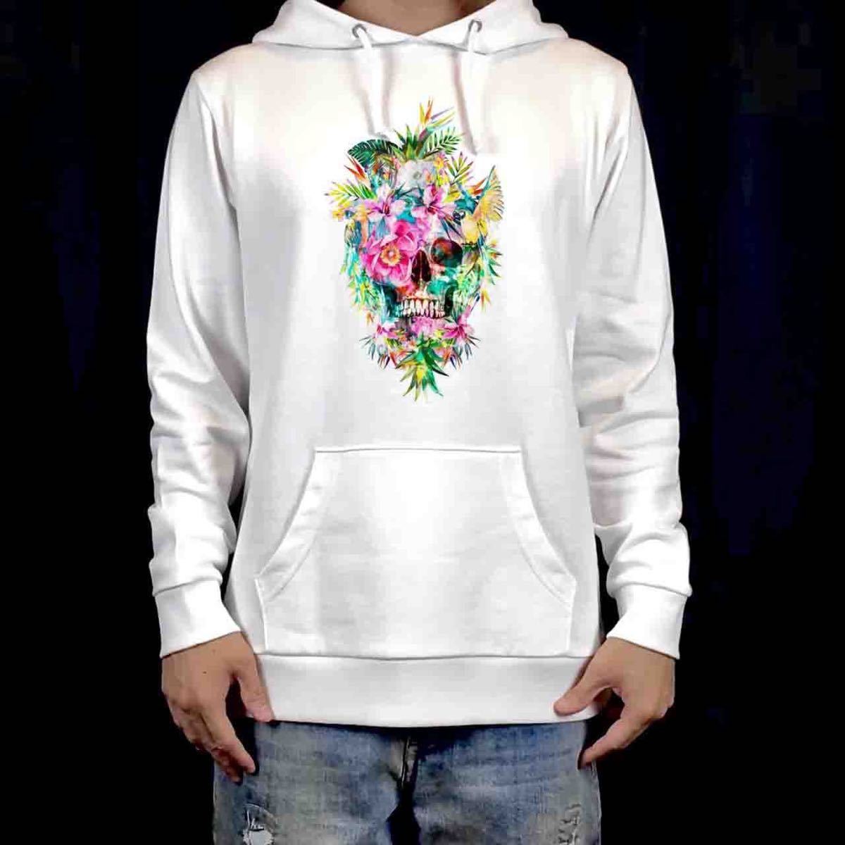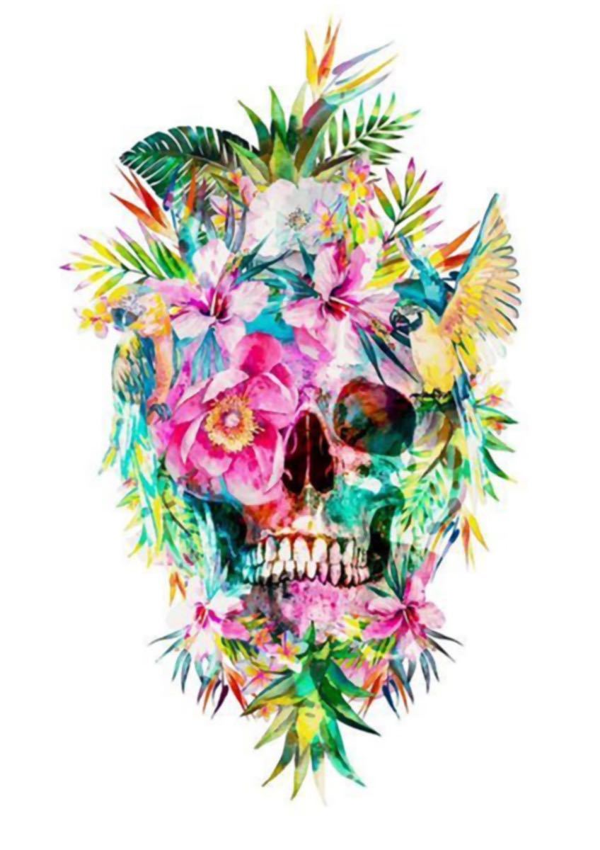 鮮やかな花や小鳥と埋もれた骸骨のコントラストがおしゃれなボタニカルデザイン。