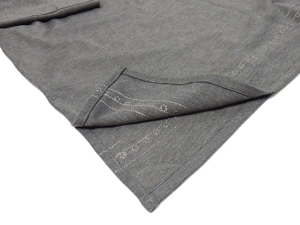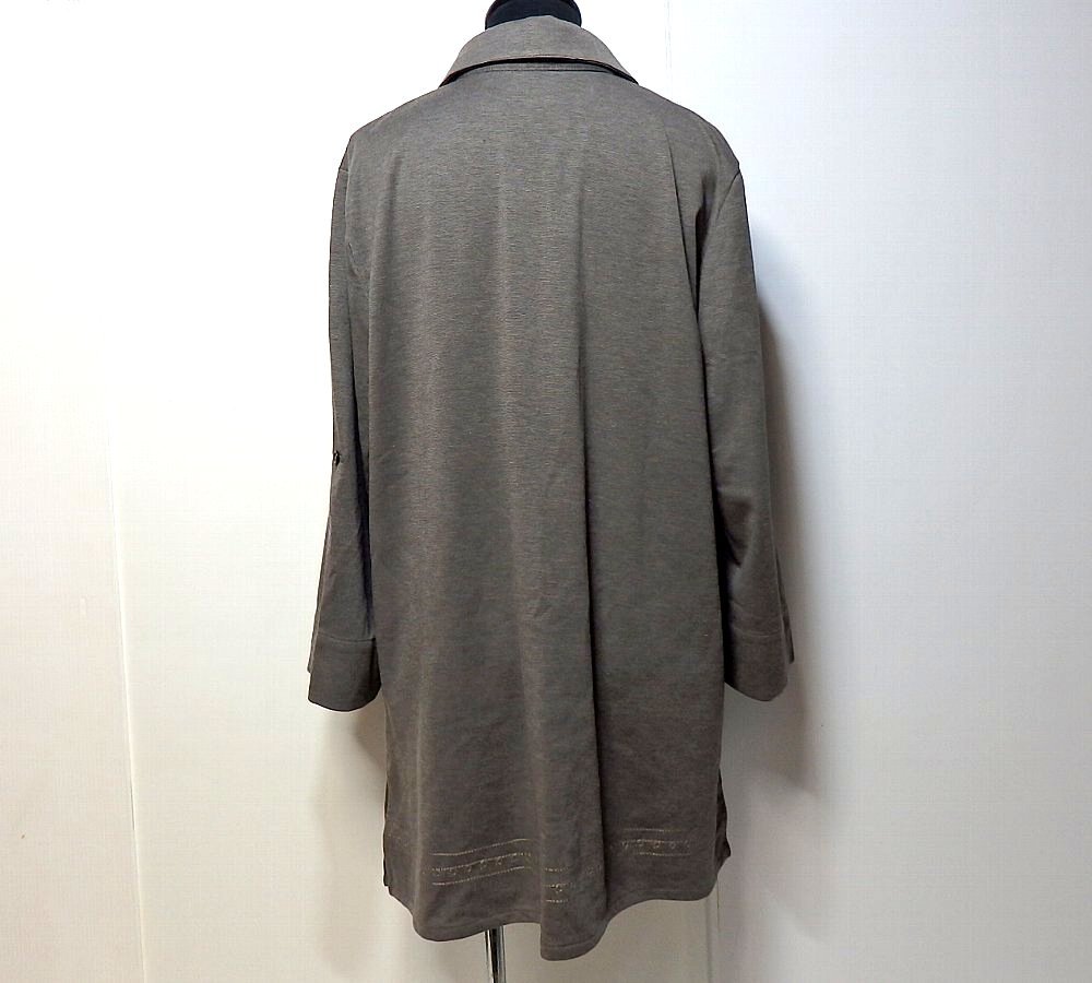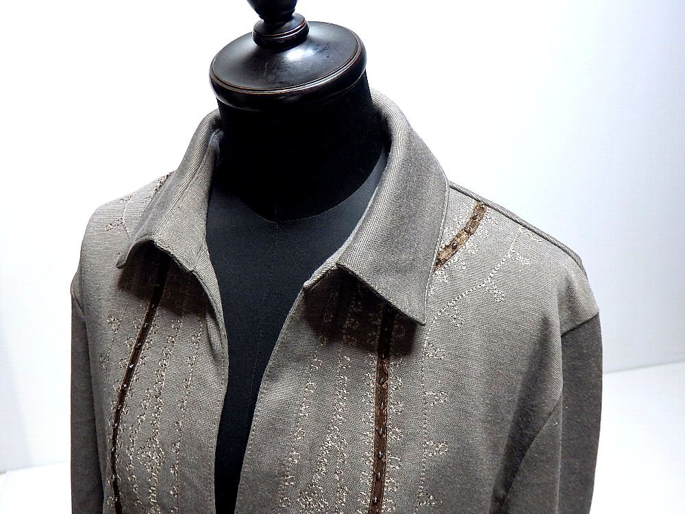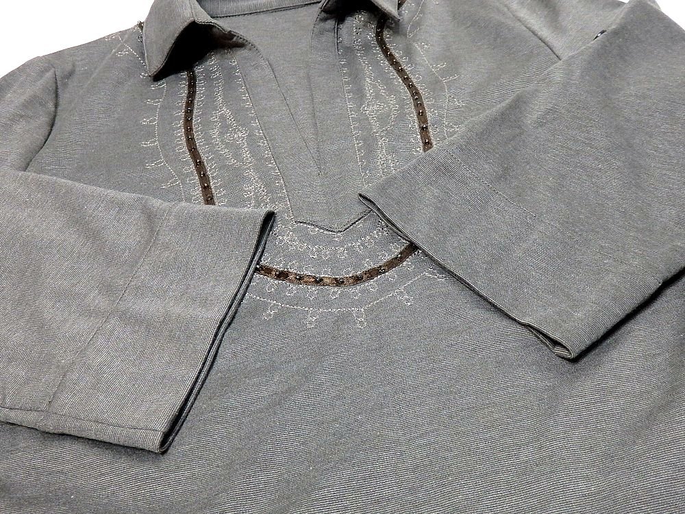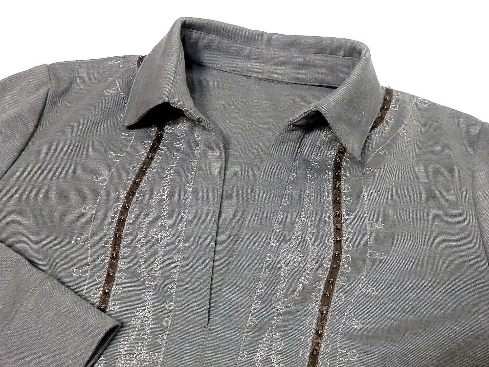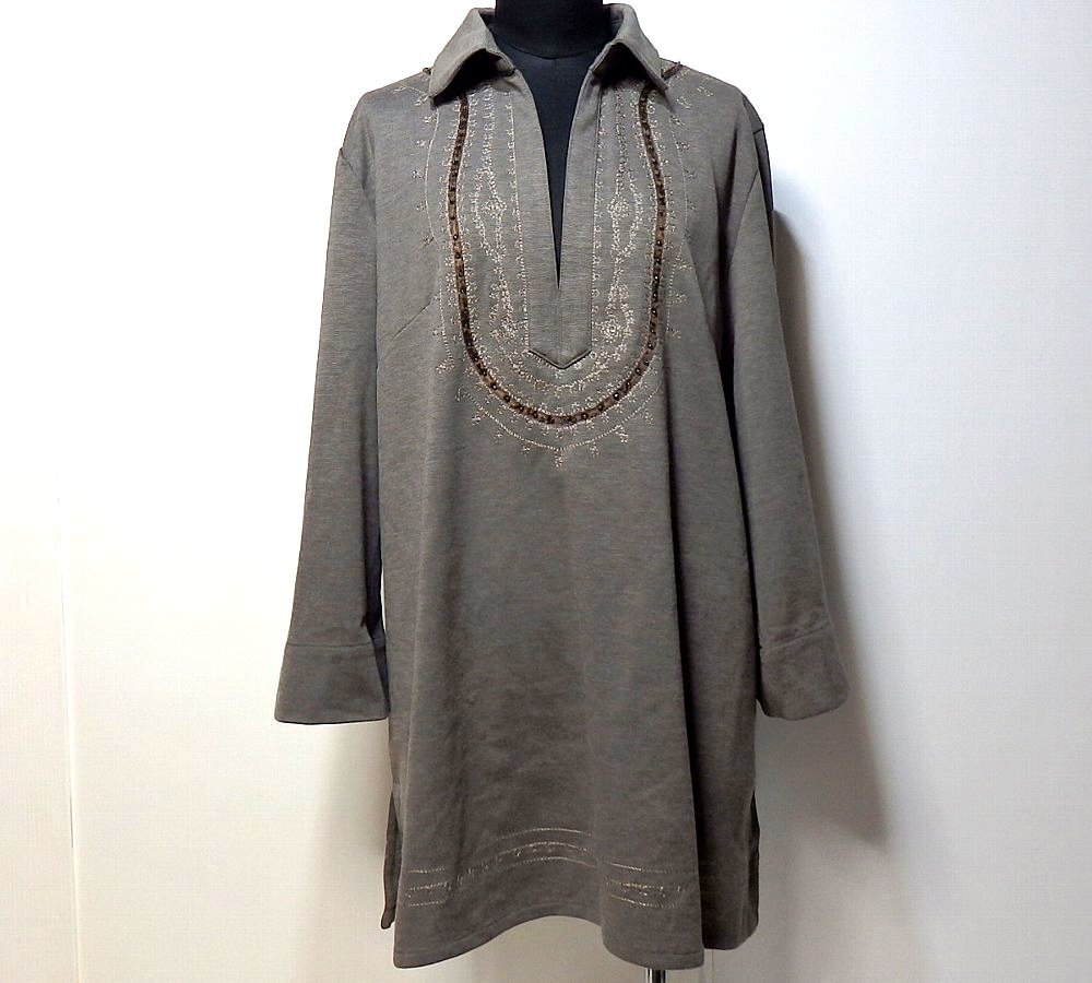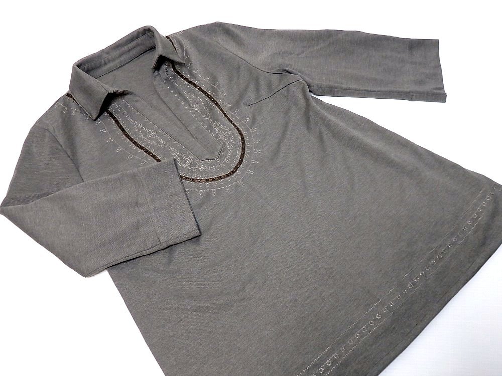 T【ナガト】ブラウングレー系に刺繍&ビーズ飾り付き・ロールアップ七部袖・チュニック・Mサイズ!
