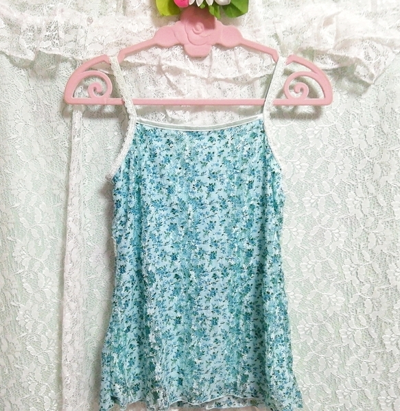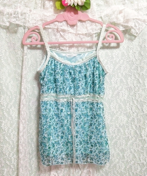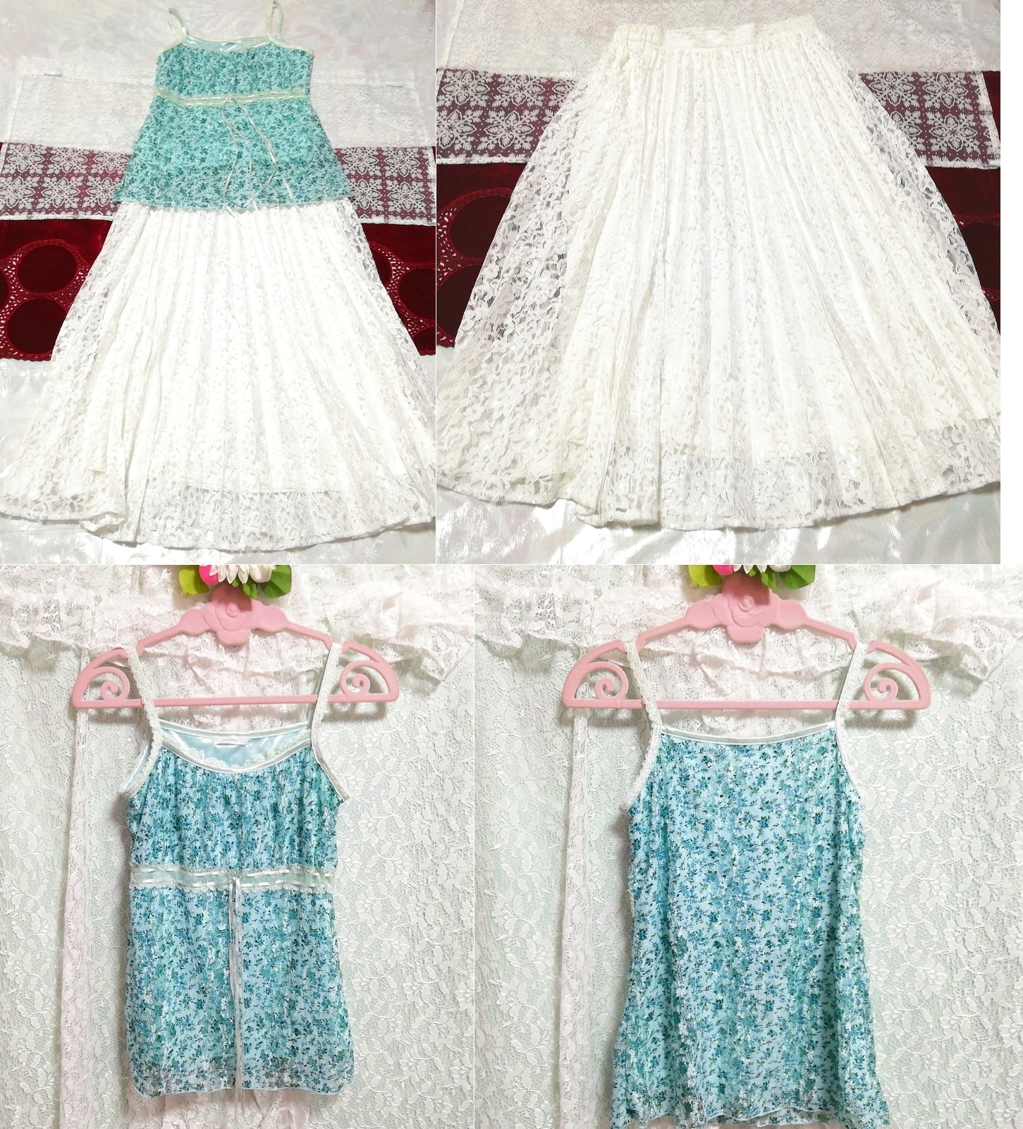 水色緑花柄フリルレースキャミソール ネグリジェ 白レースロングスカート 2P Blue green flower pattern camisole negligee white lace skirt
