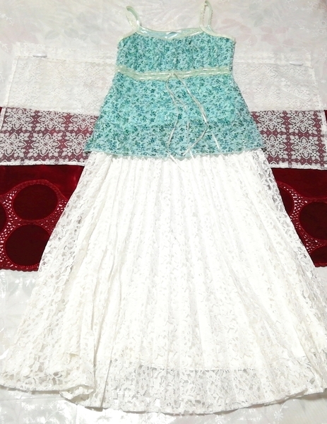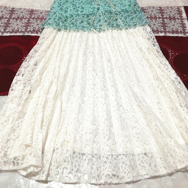 色緑花柄フリルレースキャミソール ネグリジェ 白レースロングスカート 2P Blue green flower pattern camisole negligee white lace skirt