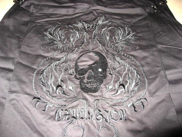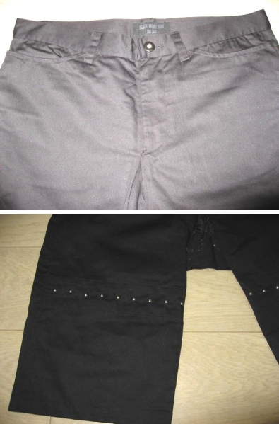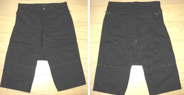 サイズMで、実寸では、(約、平置き) W :39㎝ W :47㎝ 股上 :24㎝ 股下 :45㎝ わたり幅 :29㎝ すそ幅 :22㎝ 素材 :綿97%、ポリウレタン3% 色 :黒 製造元 :㈱ピースナウ 未使用です。前掛けに黒地に黒糸で刺繍が施されていて、取り外し可能です。 |