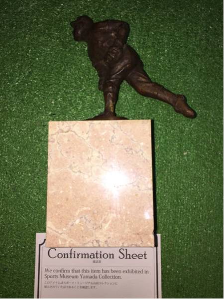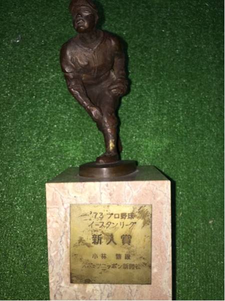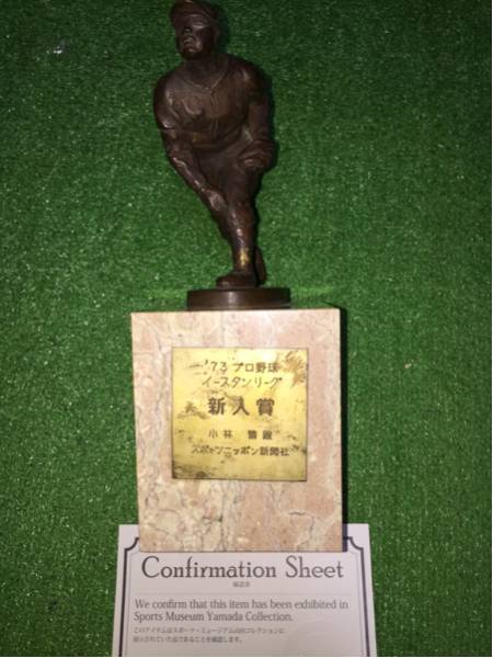 巨人軍の小林繁投手 1973プロ野球イースタンリーグの新人賞を受賞し本人へ贈呈されたトロフィーです。本人から某ミュージアムへ寄贈され展示されていました。某ミュージアムの確認書付きです。高さ25センチ、台座9×9センチ。