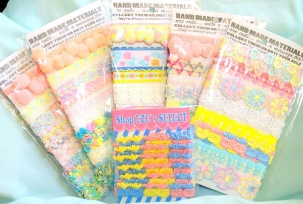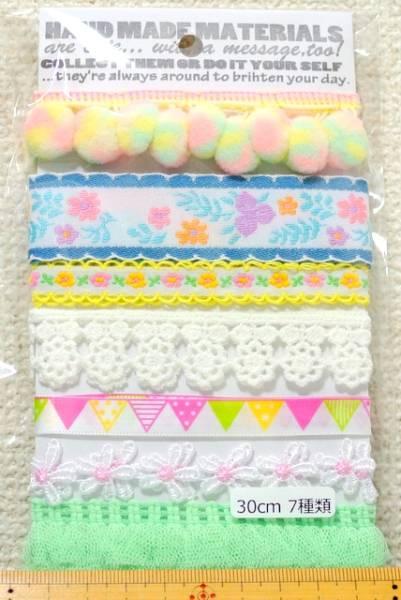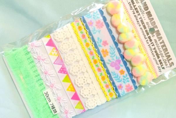 お花やぽんぽんなど、いろいろなレースとテープが7種類入ったセット。
