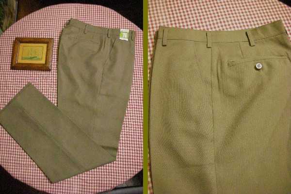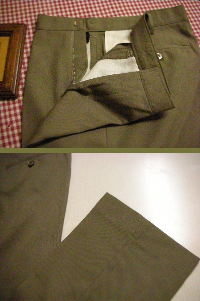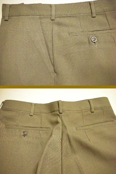 シックなグレーっぽいモスグリーン色作業パンツ。シルエットはベーシックなテーパードパンツ。ノータック Yポケットデザインです。生地素材は ポリエステル 65% レーヨン 35% です。 シワがつきにくく またアイロン不要のパーマネントプレス加工。風合いがさわやかで軽快な穿き心地 そして 型崩れしない入念な仕立てです。サイズ(実測平置採寸)は ウエスト 69cm(表示 70cm) 渡幅 29,5cm 腿幅(股下10cmの所) 26cm 裾幅 20cm 前股上 25cm 股下(裾上げ済状態) 73cm  です。  勿論 新品ですので、お好きな長さで 修理し 着用可能です。お買得価格スタートです。 尚 毎週木曜日は業務定休日で御座います。ご連絡、発送とも休業日明けにずれ込む事御了承下さい。 以上宜しくお願い申し上げます。