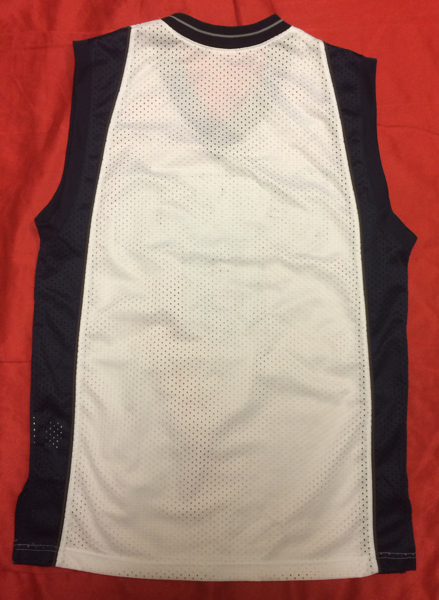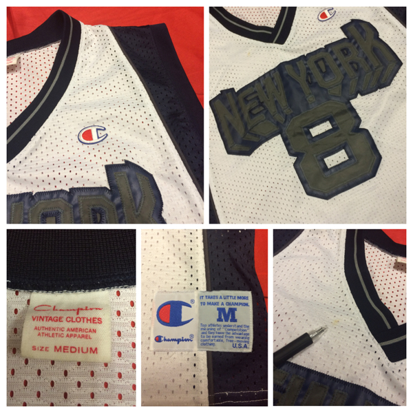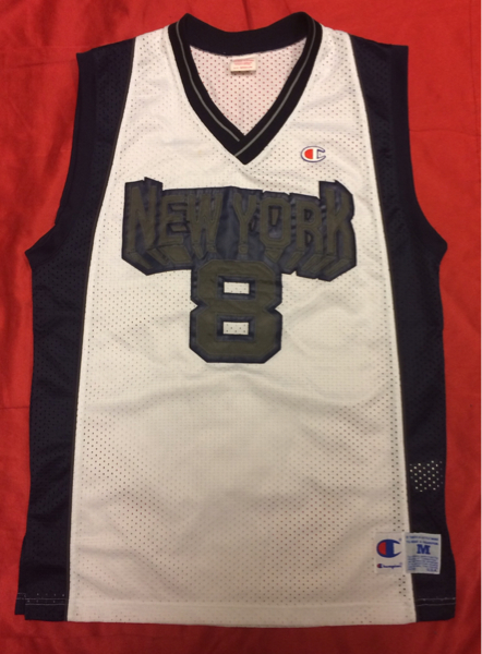 ホワイト×ネイビーのメッシュ生地のバスケタンクです☆ 胸元にはチャンピオンのワンポイントと、NEW YORKロゴと8番のワッペンが付いています。