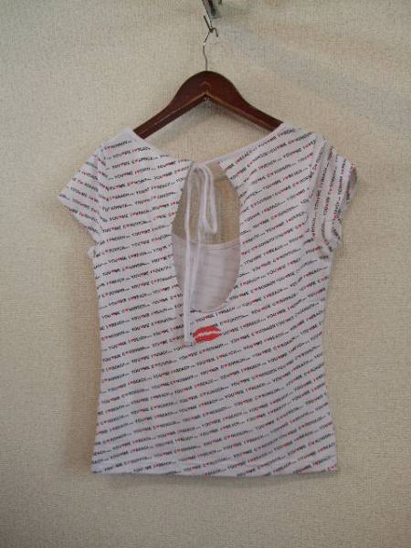 | 商品紹介 | 白地に赤と黒のプリントが入った半袖カットソーです。 後ろはエリの下が大きく開いたデザインで、穴の下に唇のプリントが付いています。 《素材》 ポリエステル62% レーヨン33% ポリウレタン5% |
