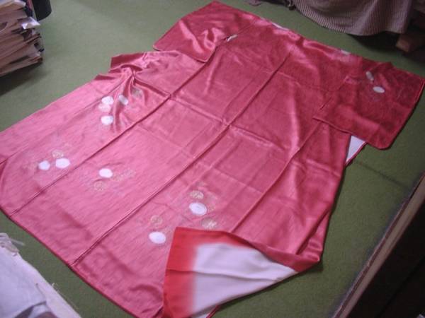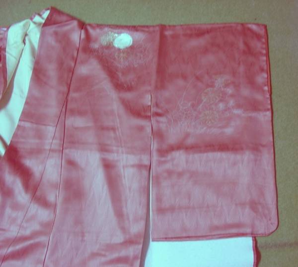 今様色の地に菊、萩、芝草が描かれています。白地部分は絞りです。金彩も使われています。
