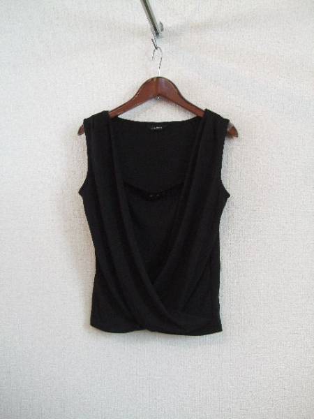 | 商品紹介 | 襟元のクリスタル風ラインストーンがポイントになったトップスです。 キャミソールとカシュクールデザインのノースリーブをレイヤードしたような デザインです。 色は黒です。 《素材》 ポリエステル100% |