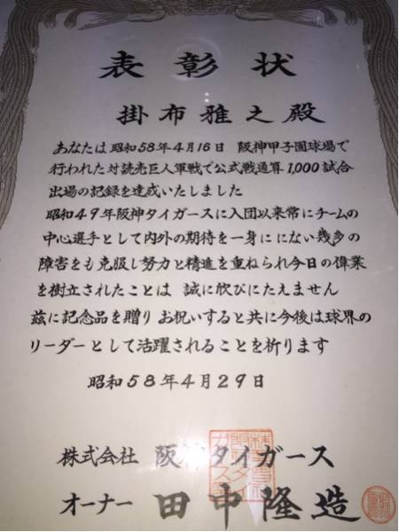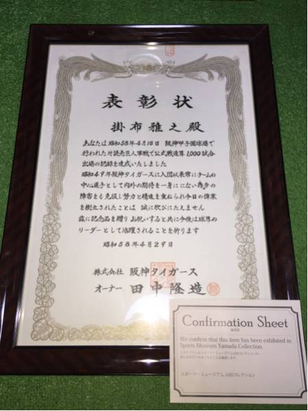 阪神タイガースの掛布雅之選手が昭和58年4月16日 公式戦1000試合出場記録を達成し阪神タイガースから贈られた表彰状です。掛布氏から某ミュージアムへ寄贈され展示されていました。某ミュージアムの確認書付きです。47センチ×34.5センチ。