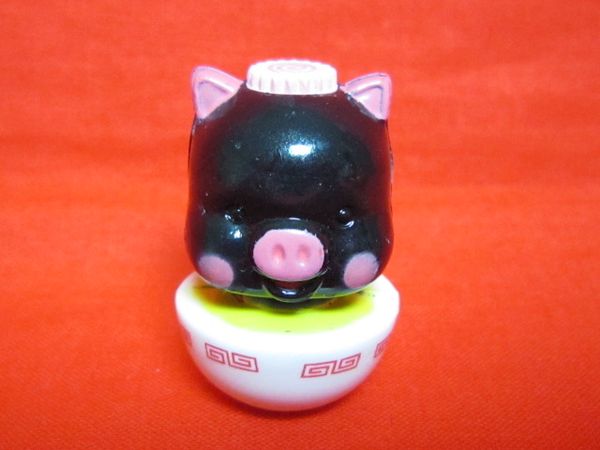 | 黒い豚さんのおきあがりこぼしです。 中古品。 ラーメンの器の中に入っています。 頭の上にはなるとが乗っています。 多少の汚れはご了承ください。 サイズ:約 高さ3cm | |