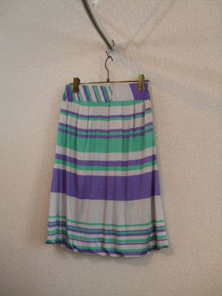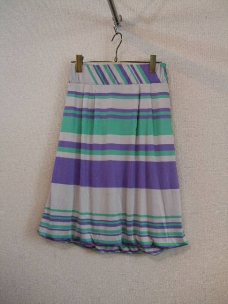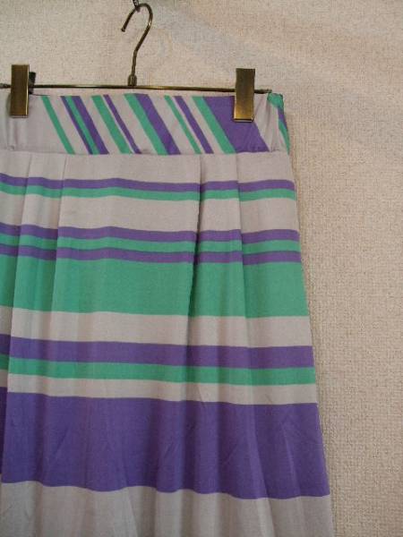 | 商品紹介 | マルチカラーのボーダースカートです。 地色は薄いグレーで、紫とグリーンのラインが入っています。 ウエストは斜めボーダーで、裾はバルーンになっています。 ウエストにタックが入った広がり過ぎない適度なフレアです。 《素材》 表地・裏地:ポリエステル100% |