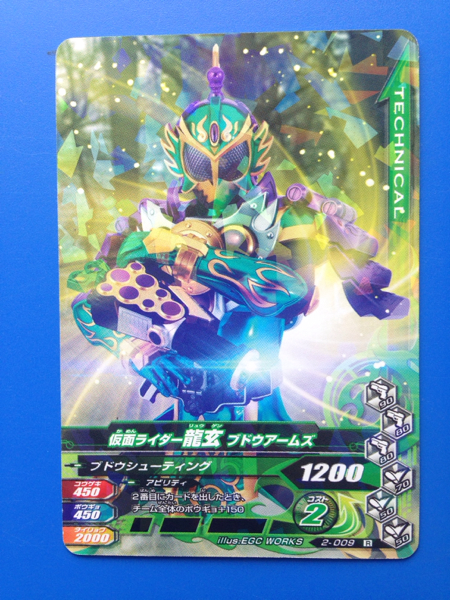仮面ライダー、ガンバライジングの第2弾から、No.009《仮面ライダー龍玄・ブドウアームズ》の登場です。発送は、普通郵便を利用します。(特にご希望のない場合)おとりまとめも可能ですが、送料に変動する場合がございます。また、送料のご請求は、自宅での計量を基準にご請求させていただいておりますので、実際の金額と差異が出る場合もございます。予めご了承ください。他にも多数出品中です。まとめてこの機会にいかがでしょうか?ご質問お待ちしております。