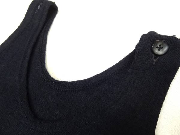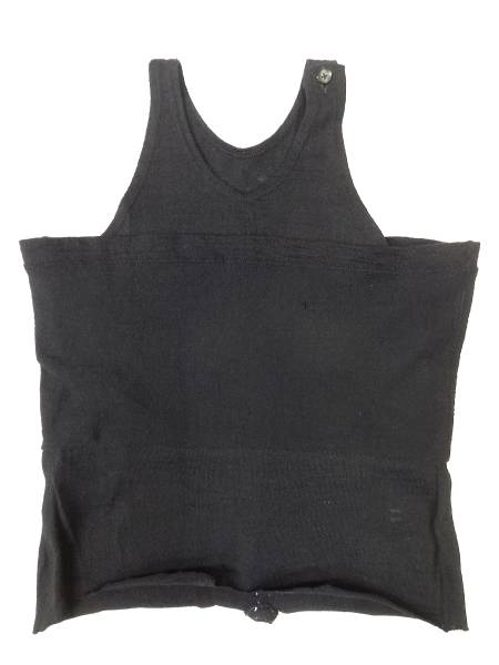 当時は化繊などがまだないのでウールが水着の素材として使用されていました。歴史を感じる一着です。今でもワンピースとして着用されるととても可愛らしいアイテムです。本来はスカートをめくるとパンツのように足が2本通せるデザインですが,これはパンツの部分をカスタムしてスカートの状態にカスタムしてあります。画像の2枚めはスカートの部分をめくってある画像です。古いものは数も少なく希少価値も上がってきているアイテムです。タグなどはありませんが,年代に間違いはありません。左肩をボタンで留める仕組みです。もともと水着として使われていただけあってある程度の伸縮性はありますので実寸は最小のサイズだとお考え下さい。