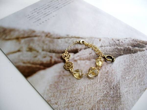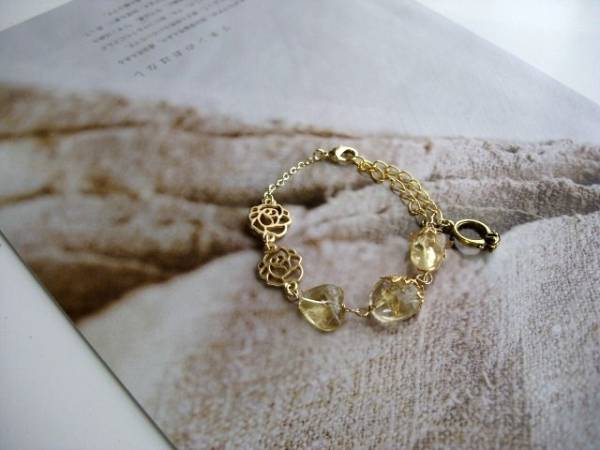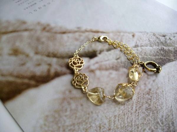特別な一日・・シリーズです♪幸せの薔薇・・華やかなシトリンのブレスレットです♪シックなマット・ゴールドの薔薇のチャームを合わせてロマンチックな表情 です♪13ミリから15ミリ位までのラフ・タンブルのシトリンは繊細な座金でおめかししました♪長さは全長23センチ位で調節自由です♪お揃いのネックレスやピアスも出品しています♪シンプルで飽きのこ ないいつまでも着けられるデザインを考えて作りました!ハンドメイドをご理解頂いてノークレーム、ノーリターンでお願いします
