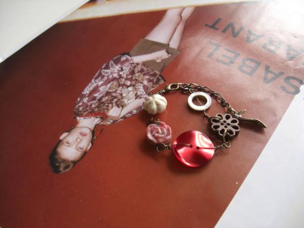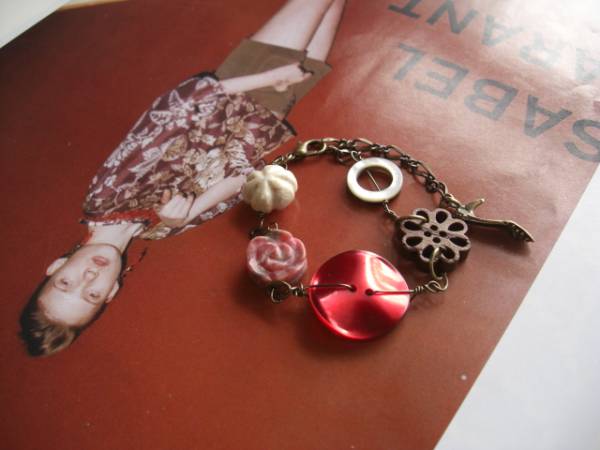 女の子・スタイル・・シリーズです♪遊び心を集めて・・シックなロードナイトのブレスレットです♪薔薇のロードナ イトは甘 すぎないダークピンクです♪リバーストーンのフラワーや個性的なアンティークボタンやシェルリングやウッドの透かしフラワーを合わせてニューヨークモダン してい ます♪ロードナイトは14ミリ位の両面薔薇です♪リバーストーンのお花は14ミリ、ウッドの透かしフラワーは17ミリ 位です♪長さは全長23センチ位で調節自由です♪お揃いのネックレスも出品しています♪シンプルで飽きのこないいつまでも着 けられるデザインを考えて 作りました!ハンドメイドをご理解頂いてノークレーム、ノーリターンでお願いします