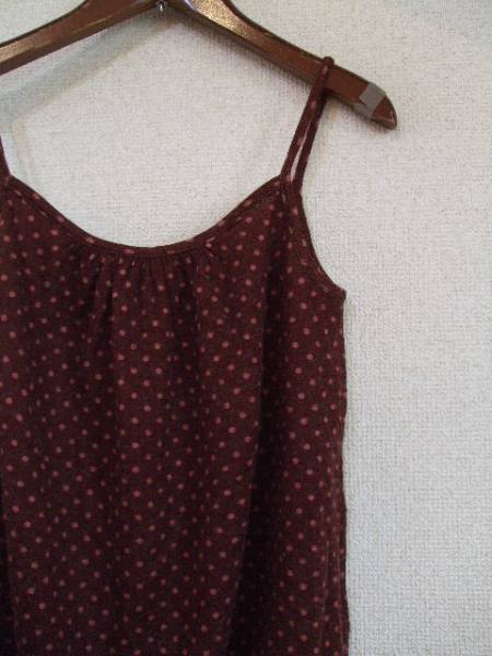 | 商品紹介 | 茶の地色にベージュピンクのドットが入ったキャミソールです。 ニット素材で、元々起毛したような素材です。 《素材》 アクリル64% ナイロン20% 毛16% |