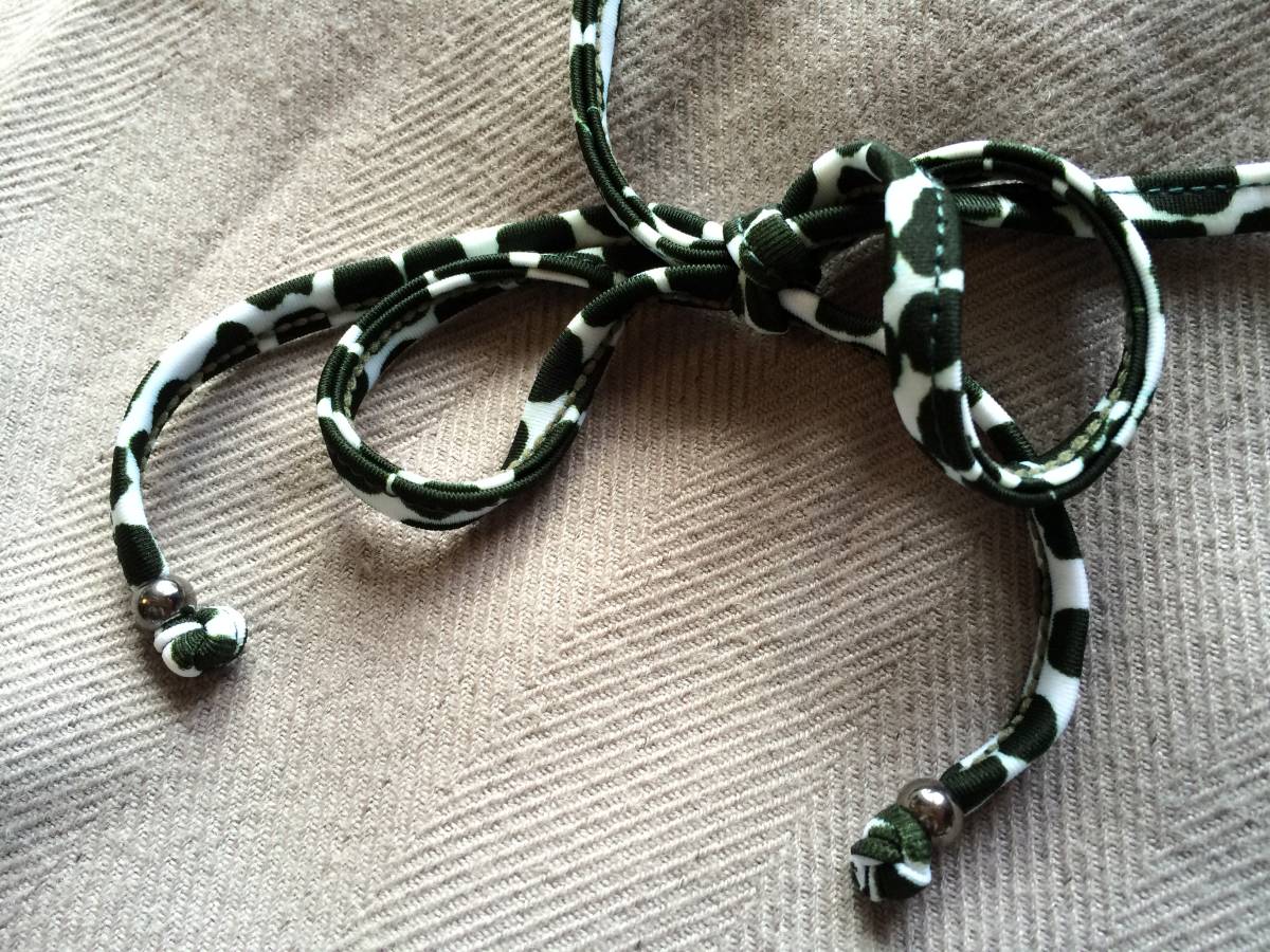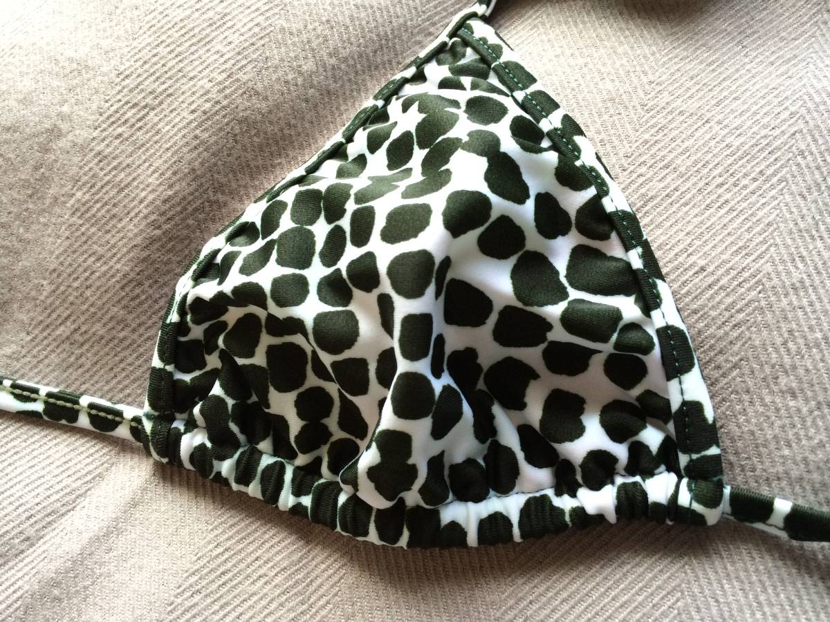 シンプルな形の三角ビキニで、それぞれリボンを結ぶような作りになっています。