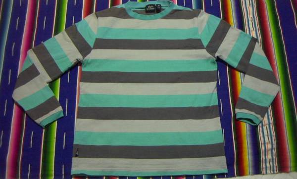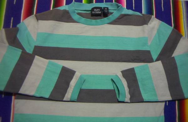 Gym Mastar 特有の良質ハイオンスコットン100%素材感、風合い有る ターコイズ調グリーン × グレーのミックスボーダーパターン、タイト目なボディーシルエット、スリーブリブ 等のディテールが相当良い感じ