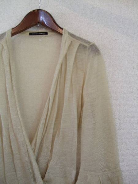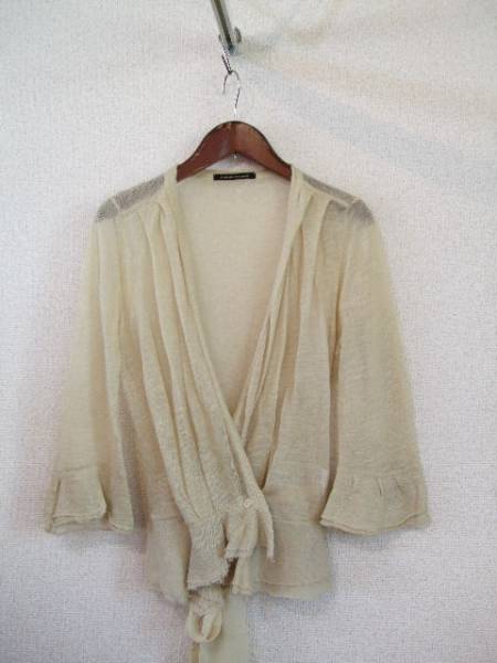 | 商品紹介 | 透け感のある涼しげなカーディガンです。 前はドレープのようになっていて、カシュクール風のボタンです。 色はベージュで、袖口と裾は生地が2重で、端は切りっぱなしです。 ウエストにはシフォン素材のリボンが付いています。(取り外しはできません。) 《素材》 指定外繊維(イラクサ)100% |
