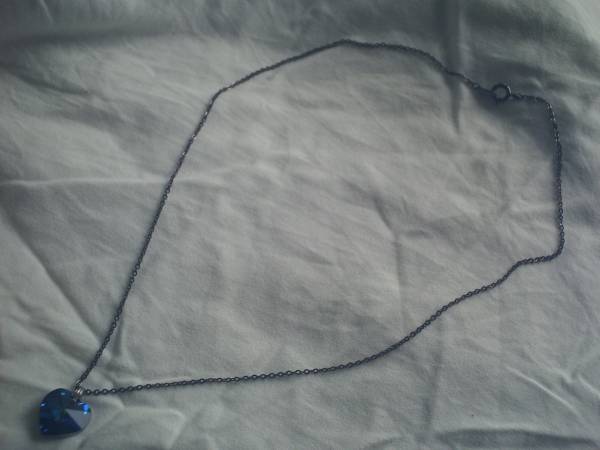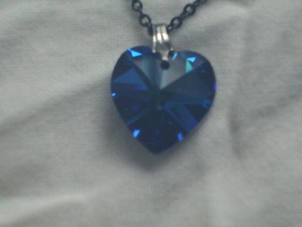 新品・ハンドメイドです。 チェーンの色は黒、長さ約45cmです。 ハートのサイズは縦14mmです。 黒光りするブルーのハートのペンダントです。 角度によっていろいろな色に見え、深い海のようなきれいな神秘的なお色です。 おそろいのイヤリング、ピアスも出品中です。 オーストリアのスワロフスキー社のクリスタルガラスのハートを使って作ったペンダントです。 ハート部分のみがスワロフスキーのものです。 |