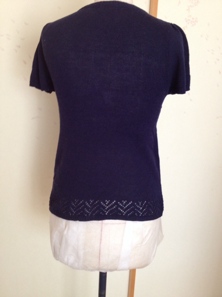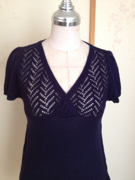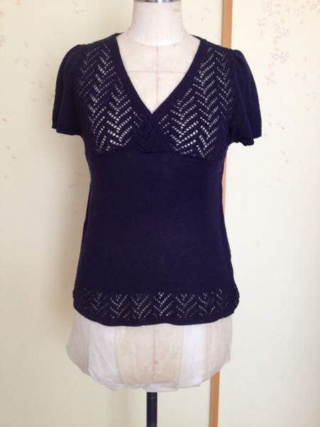 胸と裾にレース編みの入ったサマーセーターです。サイズはM 材質はアクリル75%ナイロン25%です。
