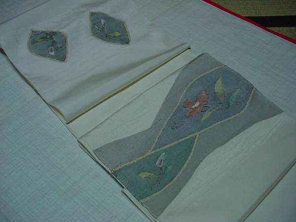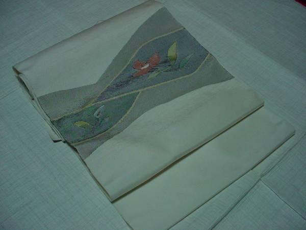 オフホワイト地に縦糸、横糸を組み合わせ、細い繊維を綴れ織りにし彩を出した上品な帯地です。