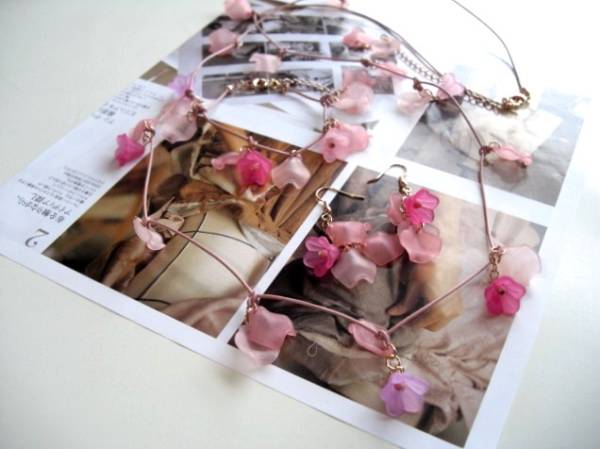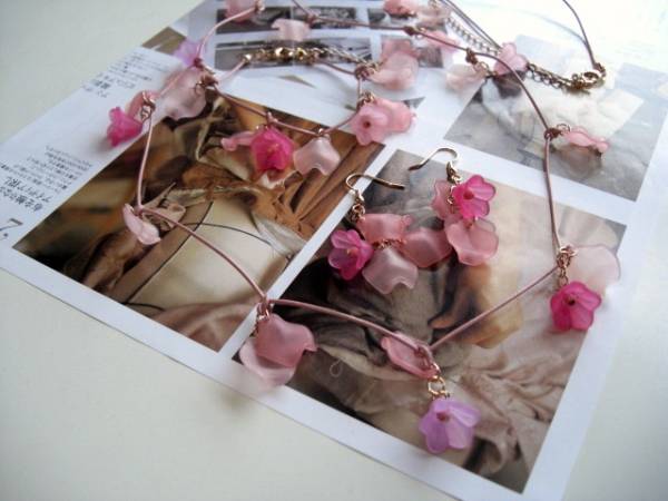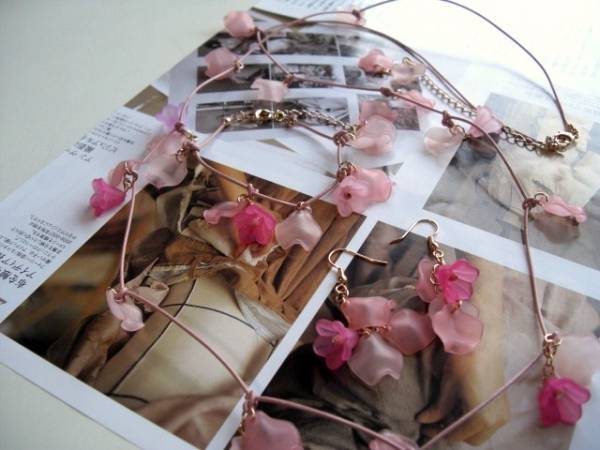 春の予感・・シリーズです♪花びらを紡いでⅡ・・大人っぽいサーモンピンクやライト・パープルなど表情の違うアクリルの花びらのネックレスとブレスレット、ピアスの3点セットです♪サーモン・ピンクのレザー・コードで紡いでやさしい表情です♪花びらやお花は12ミリ位です♪ネックレスは94センチ+アジャスター14センチで最長108センチ位です♪2連にされても素敵です♪ブレスレットは16センチ+アジャスター6センチで最長22センチ位です♪ピアスは6センチ位です♪イヤリングにも変更出来ます♪単品でも出品しています♪♪シンプルで飽きのこないいつまでも着けられるデザインを考えて作りました!ハンドメイドをご理解頂いてノークレーム、ノーリターンでお願いします