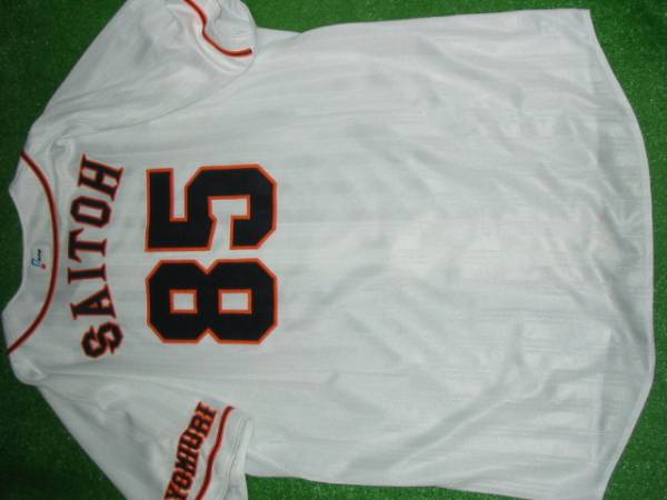 巨人軍・斉藤投手コーチが数シーズン実使用したホーム用のユニホームです。コーチは支給数が少ないので使用頻度が高く、タグの印字が消えてしまい、解れてしまっております。
