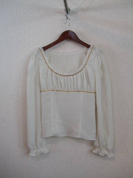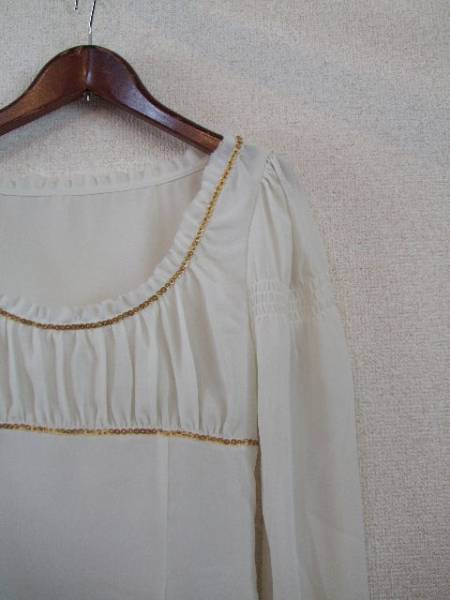 | 商品紹介 | 襟元と胸下のゴールドのスパンコールがポイントになったブラウスです。 やや襟元が広く縁にはフリルが付いています。 袖はパフスリーブで全体にクラシックな雰囲気のデザインです。 色はややクリームがかった白で左脇に脱着用のファスナーが付いています。 《素材》 ポリエステル100% |