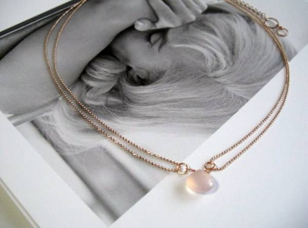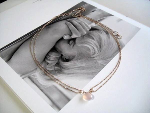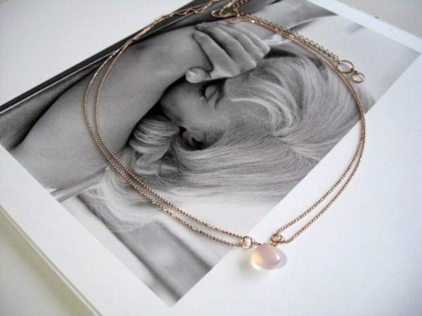 小粋にセレクト・・シリーズです♪モンローに憧れて・・繊細なピンクカルセドニーのネックレスです♪コロンと可愛いマロンシェイプのピンクカルセドニーにピンクゴールドのボールチェーンを2連にして可憐な表情です♪ピンクカルセドニーは12ミリ位です♪長さは58センチ+アジャスター14センチで最長72センチ位です♪お揃いのイヤリングも出品しています♪シンプルで飽きのこないいつまでも着けられるデザインを考えて作りました!ハンドメイドをご理解頂いてノークレーム、ノーリターンでお願いします