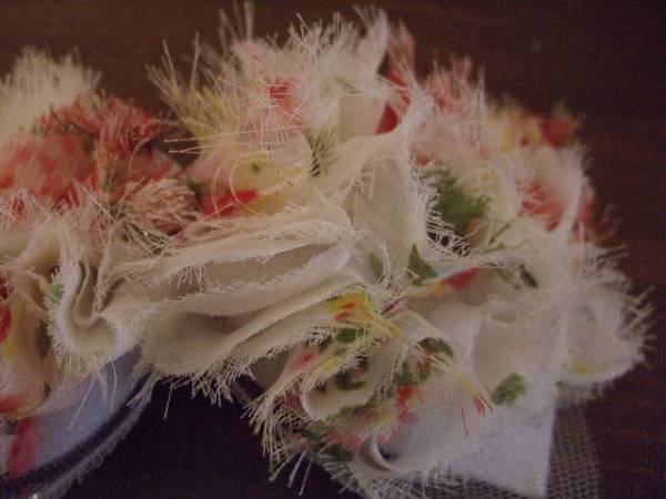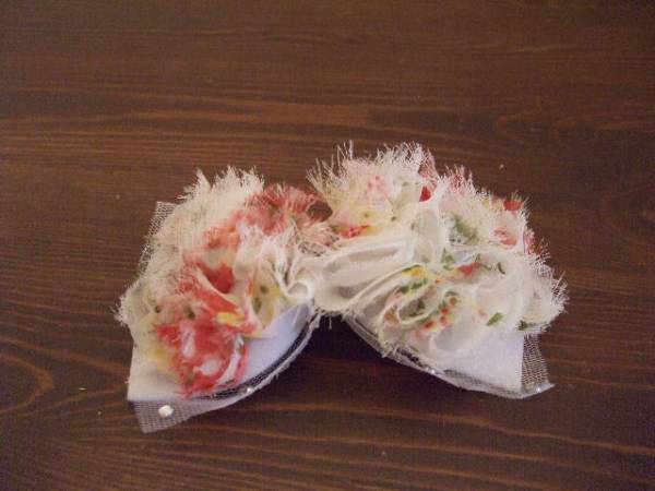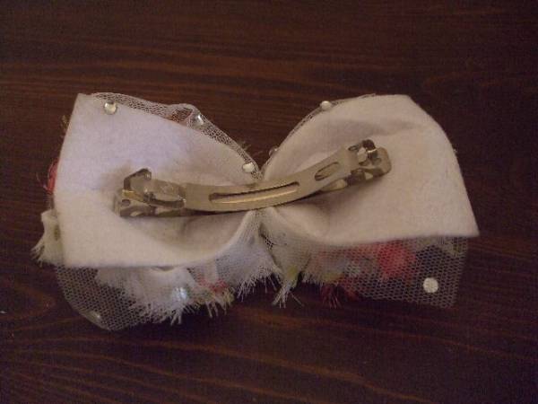 商品紹介 | 花柄レースを使って、リボン型に作ったバレッタです。 白地に赤と緑が入っていて可愛いです。 |