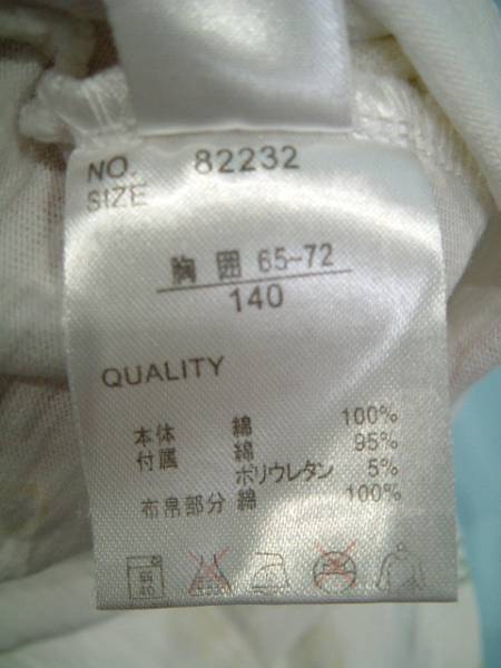 ・白です。実物とは、多少色が違って見える場合があります。 ・サイズ 140㎝です。実寸で、胸幅38 着丈42センチくらいです。 ・新品ではありませんので、着用感が多少あります。気になる方はご遠慮ください。 商品到着後の色がイメージと違う、サイズが合わないなどのクレーム、返品は一切お受けできません。 そのようなご心配のある方の入札はご遠慮下さい。 ・新品ではありませんので、完璧な商品をお求めの方は入札をお控え下さい。