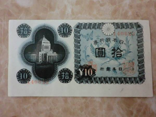日本銀行券A号10円 議事堂10円の富士工場で裁断が上にズレ有りのエラー品です。