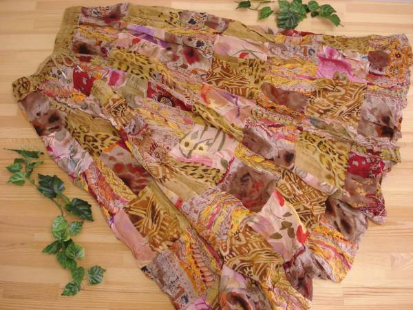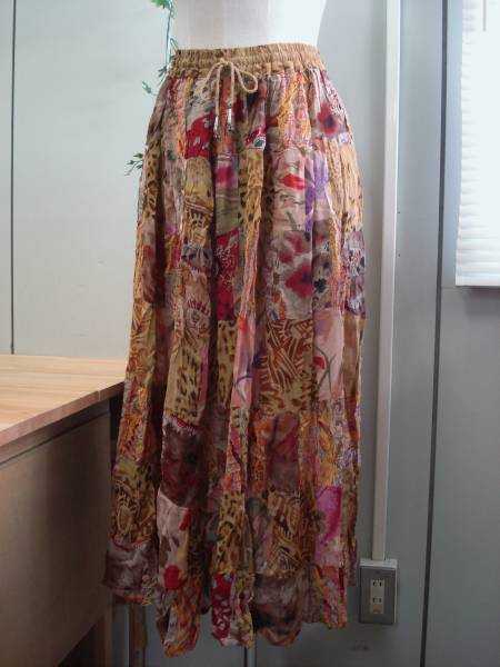 マルチな布をあわせたエスニックな雰囲気漂うロングスカートになります。