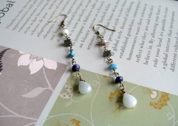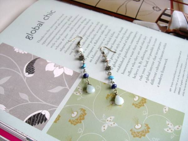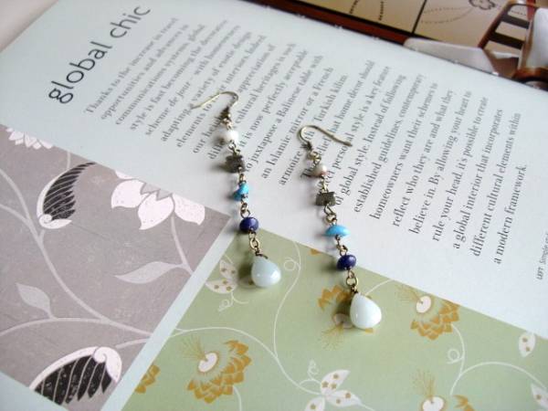 私的・クローゼット・・シリーズです♪秋色パンク・・キュートなアマゾナイトのピアスです♪シックな水色のアマゾナイトに濃紺のラピスラズリやパイライトを合わせてニューヨーク・モダンしています♪アマゾナイトは5ミリのボタンカットや12×8ミリのフラットドロップ、ラピスラズリは5ミリ位のボタンカット、パイライトは6ミリ位のラフカットです♪長さは9センチ位です♪イヤリングにも変更出来ます♪お揃いのネックレスやブレスレットも出品しています♪シンプルで飽きのこないいつまでも着けられるデザインを考えて作りました!ハンドメイドをご理解頂いてノークレーム、ノーリターンでお願いします