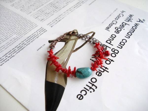 秋色・クローゼット・・シリーズです♪ヒロインの条件・・シックな深い赤の珊瑚のブレスレットです♪存在感のあるターコイズのタンブルを合わせてスタイリッシュな表情です♪珊瑚は長さ6ミリから15ミリ位までのさざれです♪ターコイズは11ミリ×13ミリ位のタンブルです♪長さは全長23センチ位で調節自由です♪お揃いのネックレスも出品しています♪シンプルで飽きのこないいつまでも着けられるデザインを考えて作りました♪ハンドメイドをご理解頂いてノークレーム、ノーリターンでお願いします