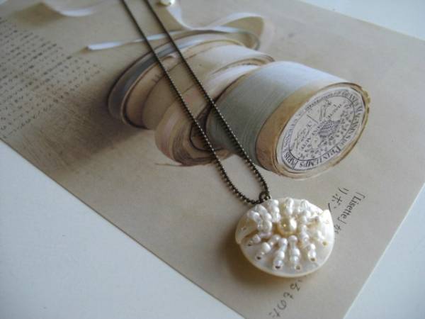 初夏のクローゼット・・シリーズです♪白のリネン・・やさしいオフホワイトのシェルのネックレスです♪淡水パールでおめかししたシェルトップがロマンチックな表情です♪小粒の淡水パールで飾った30ミリのシェルトップのネックレスは華奢なボールチェーンを合わせました♪長さは65センチ+アジャスター13センチで最長78センチ位です♪お揃いのネックレスやブレスレットも出品しています♪シンプルで長く着けていただけるデザインを考えて作りました!ハンドメイドをご理解頂いてノークレーム、ノーリターンでお願いしま