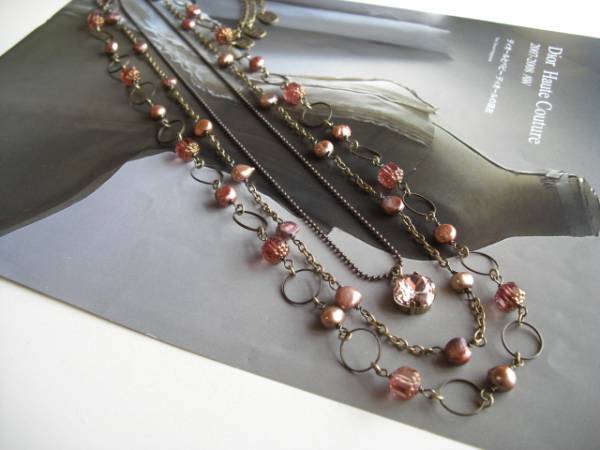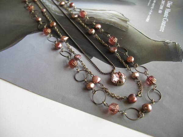 ミランダの日曜日・・シリーズです♪アンニュイな薔薇色・・シックなブラウンピンクの淡水パールとスワロとチェコビーズのネックレス3点セットです♪色々な組み合わせで楽しんでいただけます♪淡水パールは7ミリ位のポテト、アンティークデザインのチェコビーズは8ミリ、ヴィンテージピンクのスワロは12ミリ位のスクエアです♪淡水パールとチェコビーズのネックレスはデザインリングを合わせました♪長さは102センチ位で調節自由です♪2連にされても素敵です♪スワロのネックレスは華奢なボールチェーンを合わせました♪長さは72センチ+アジャスター13センチで最長85センチ位です♪淡水パールのネックレスは80センチ+アジャスター14センチで最長94センチ位です♪2本セットやお揃いのブレスレットも出品しています。ハンドメイドをご理解頂いてノークレーム、ノーリターンでお願いします