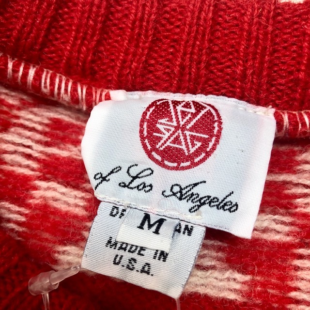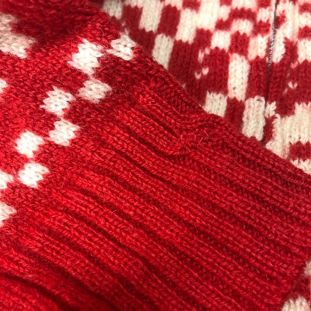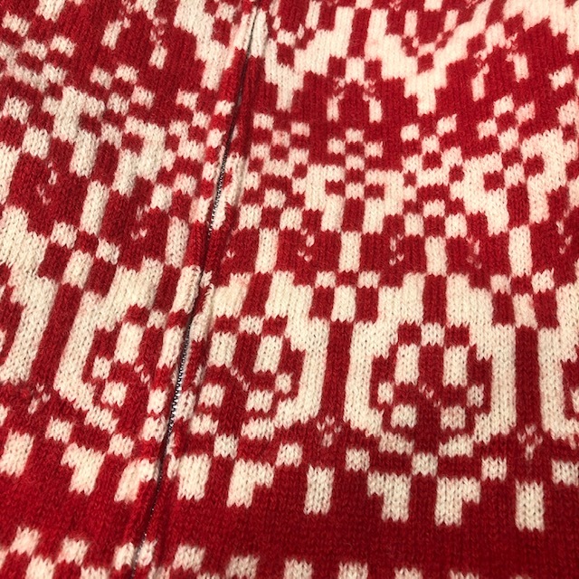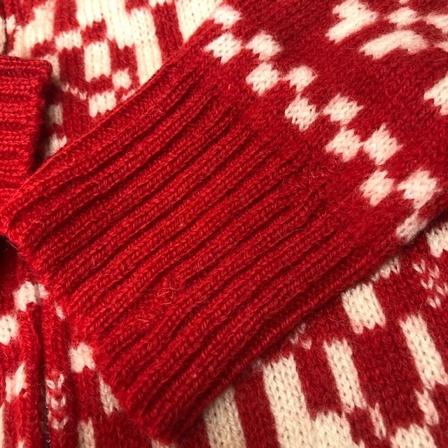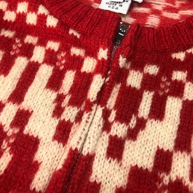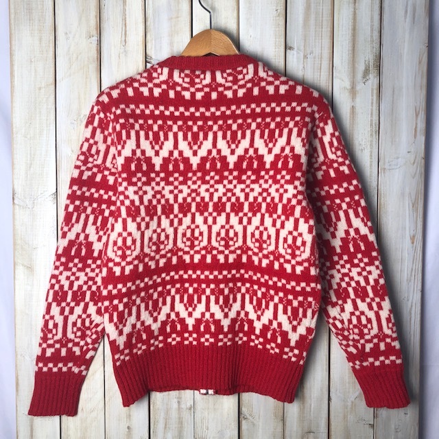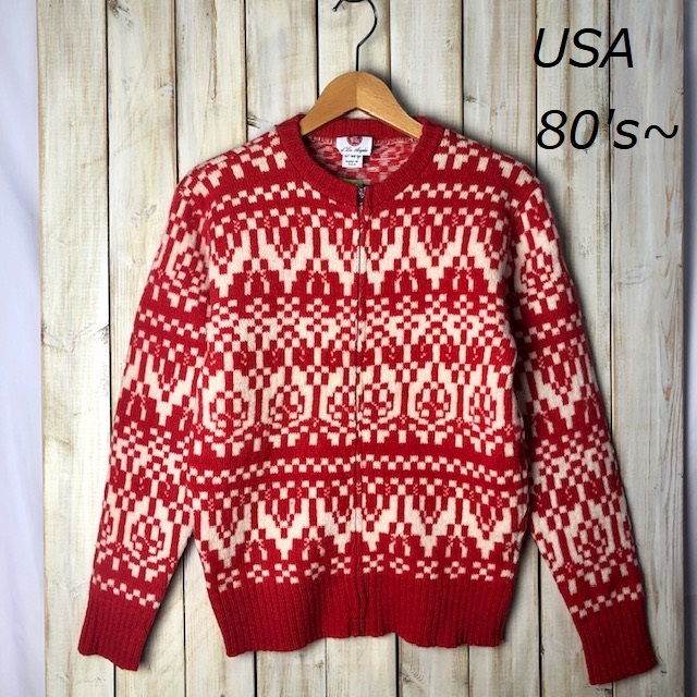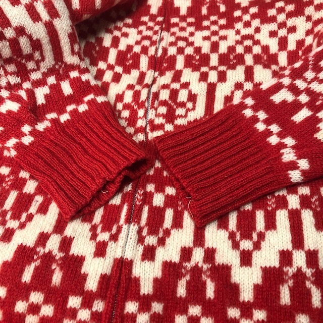 ●商品説明・・・アメリカ買い付け品になります。70年代頃~80年代頃の赤と白の毛糸で総柄に織られたフルジップのニットセーター(カーディガン)です。made in USAです。USAのMサイズ表記ですが、やや小さめな作りで、メンズのSぐらいの方や、レディースのM~Lぐらいのサイズ感かと思います。