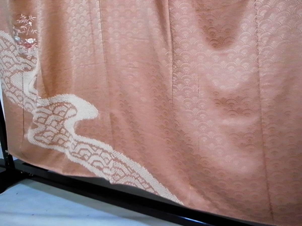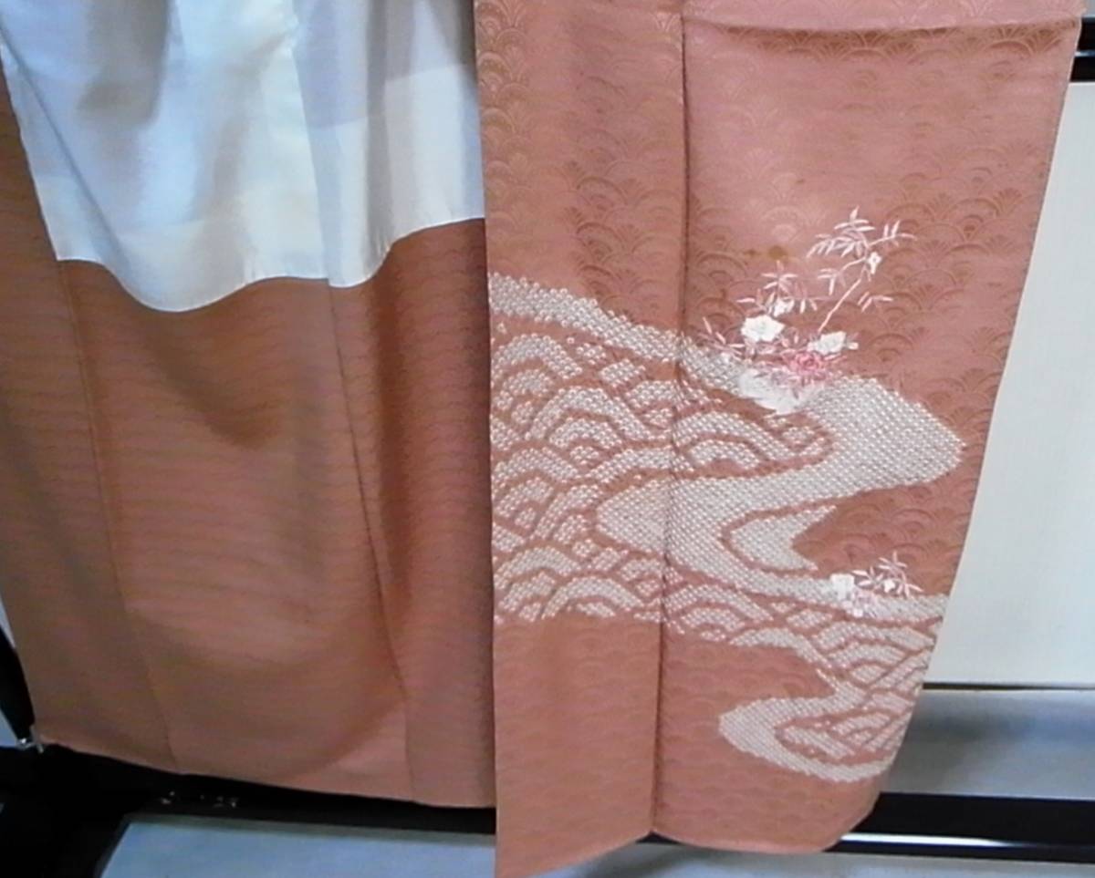 【着物のちさと屋】D34 着物・付下げ 袷 良質 美品 正絹綸子ちりめん 極薄茶色・青海波地模様流水絞り柄刺繍花柄図